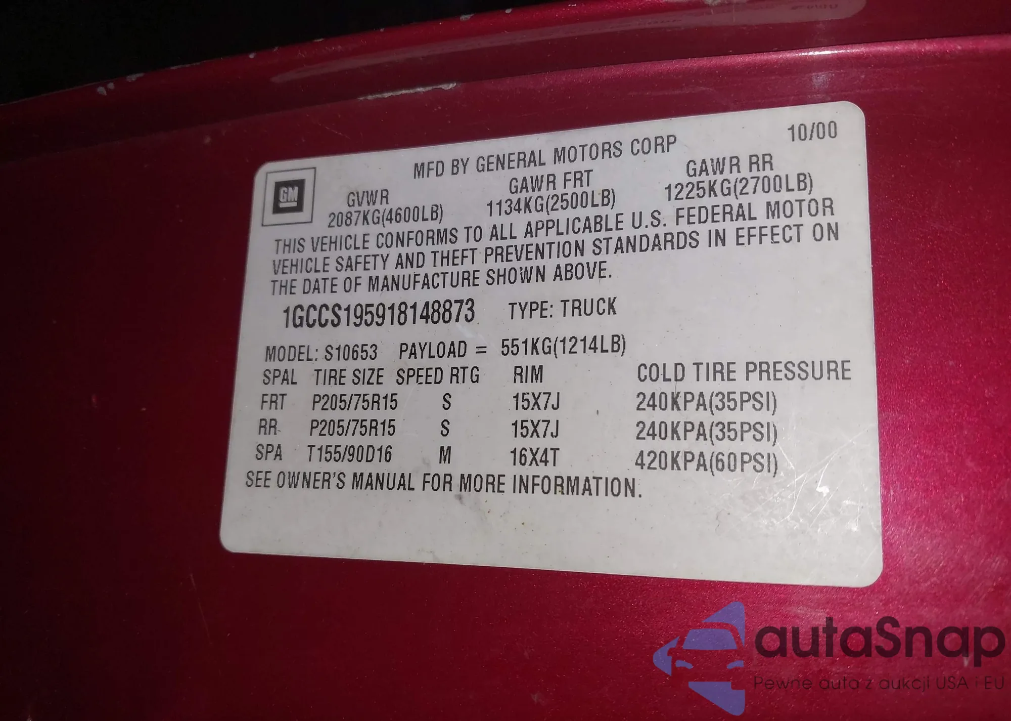 • VIN 1GCCS195918148873