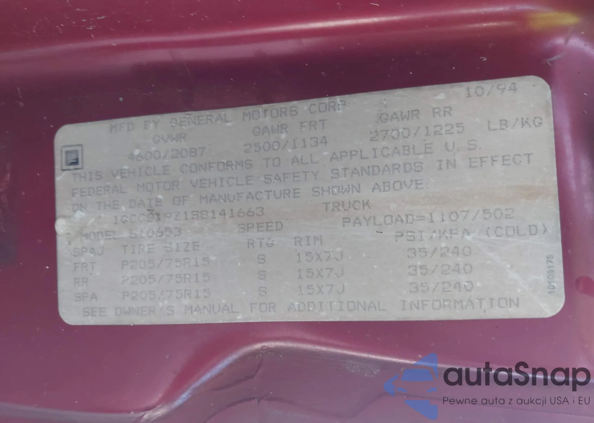 • VIN 1GCCS19Z1S8141663
