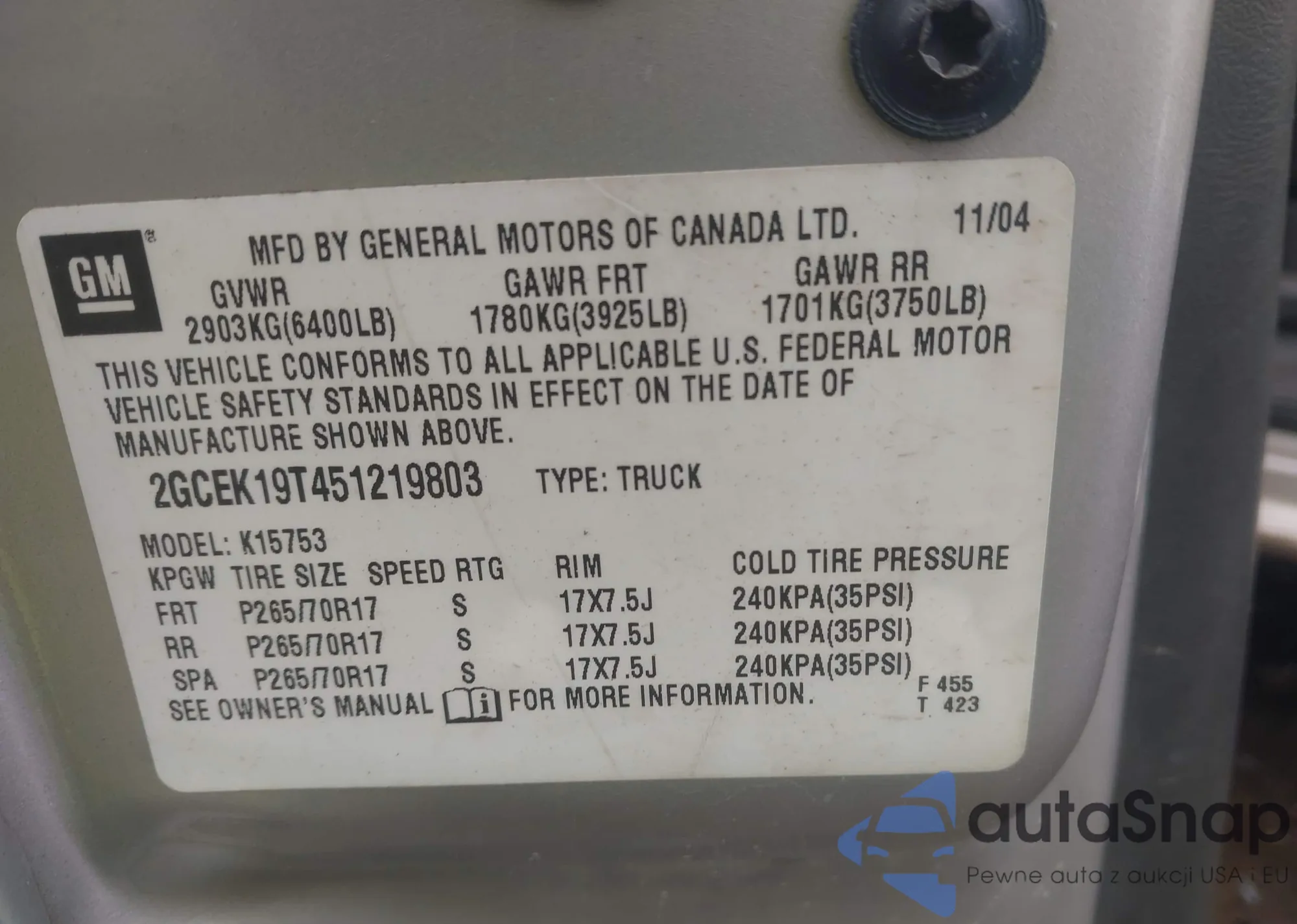 • VIN 2GCEK19T451219803