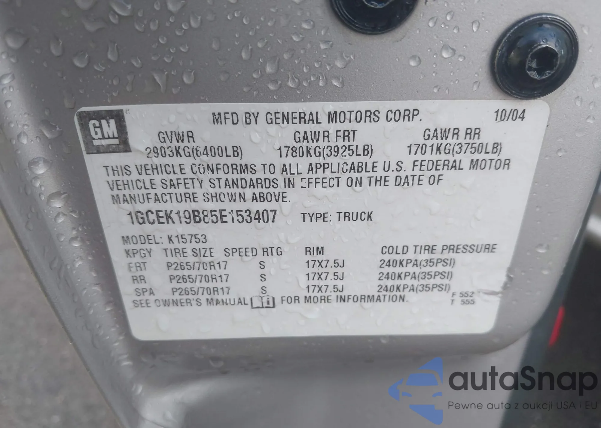 LOT: 44509963 VIN: 1GCEK19B85E153407