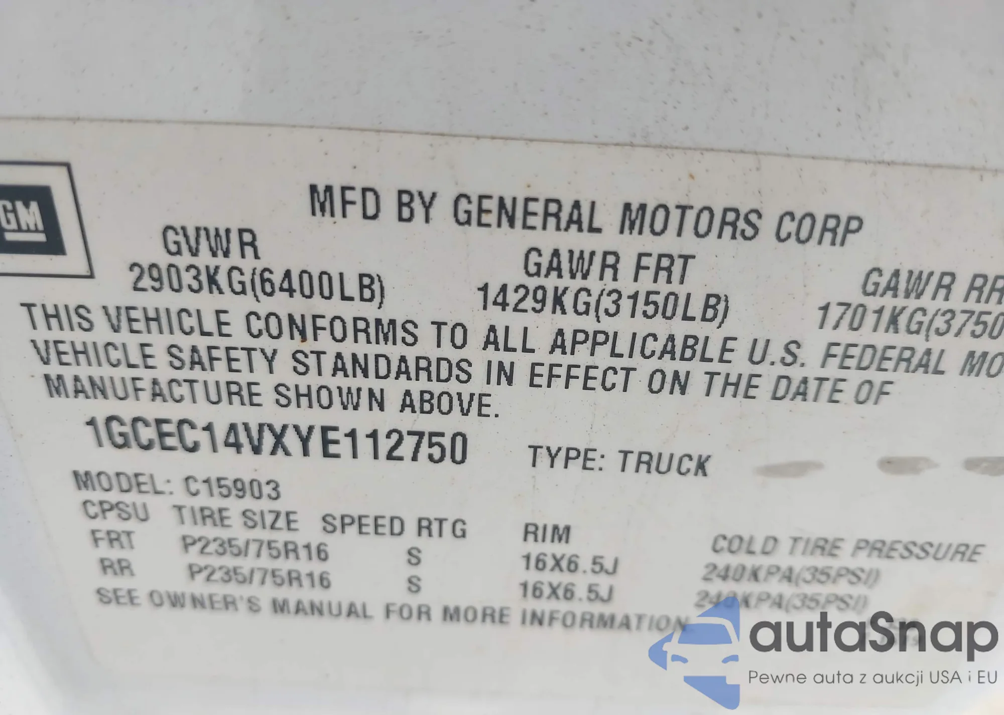 • VIN 1GCEC14VXYE112750