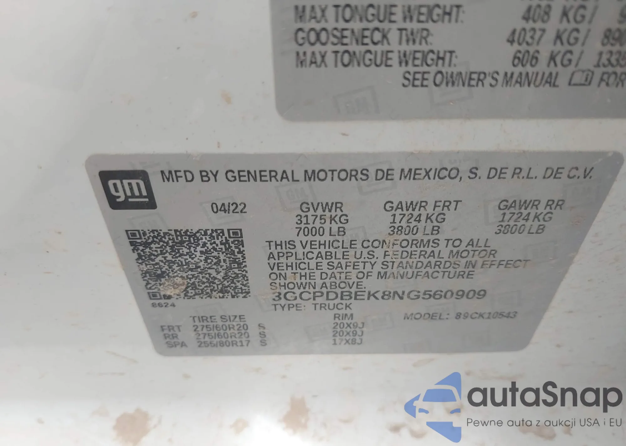 • VIN 3GCPDBEK8NG560909