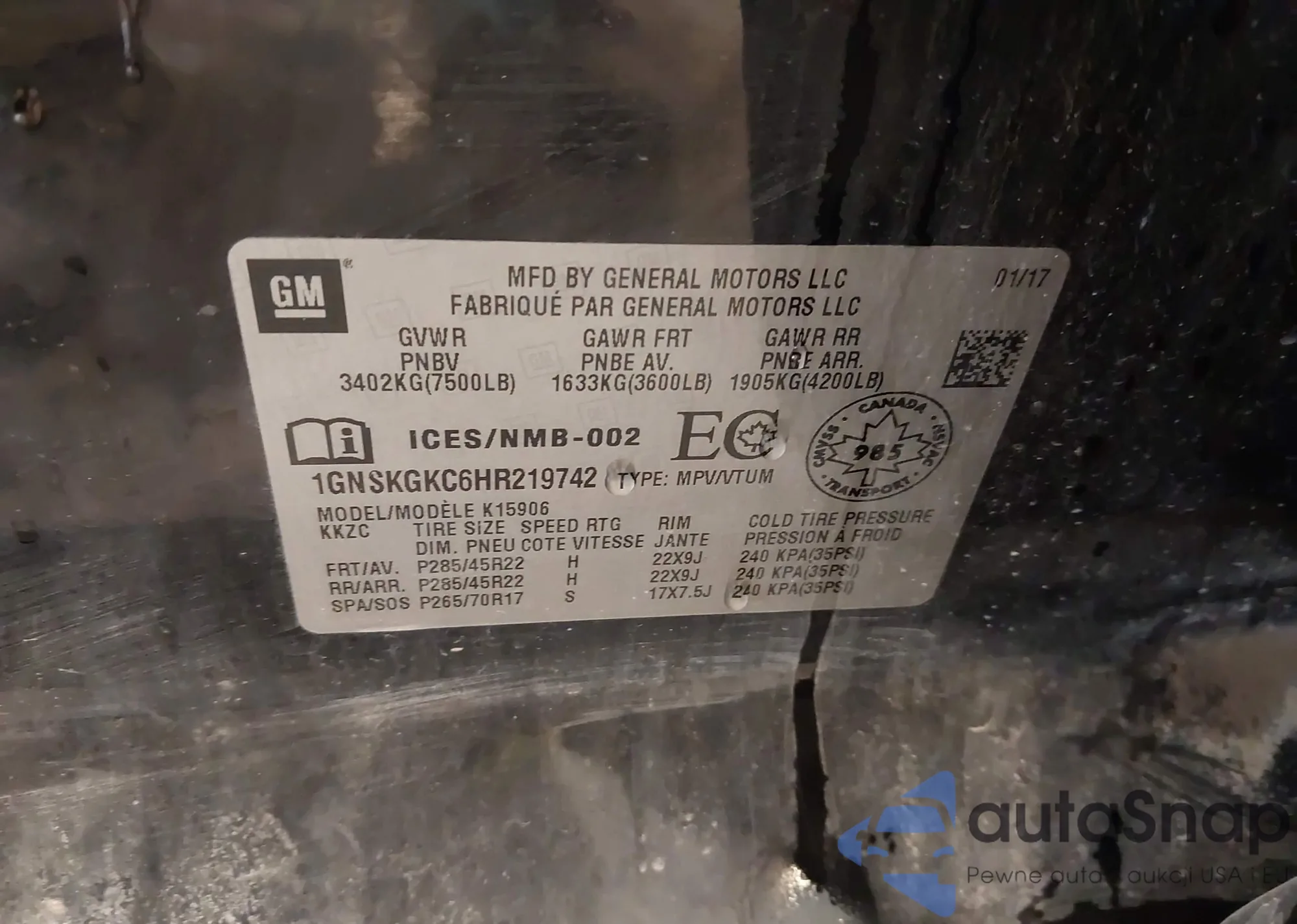 • VIN 1GNSKGKC6HR219742