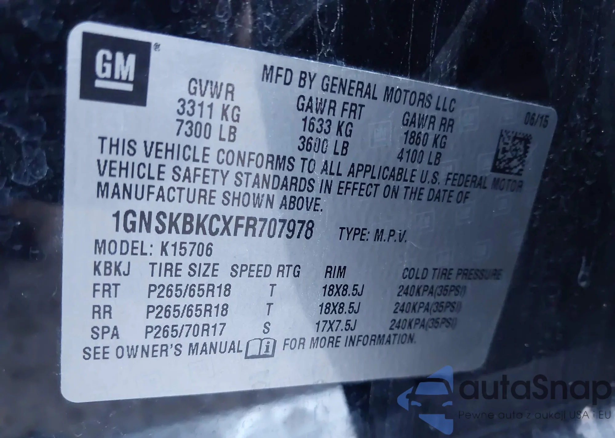 LOT: 43803727 VIN: 1GNSKBKCXFR707978