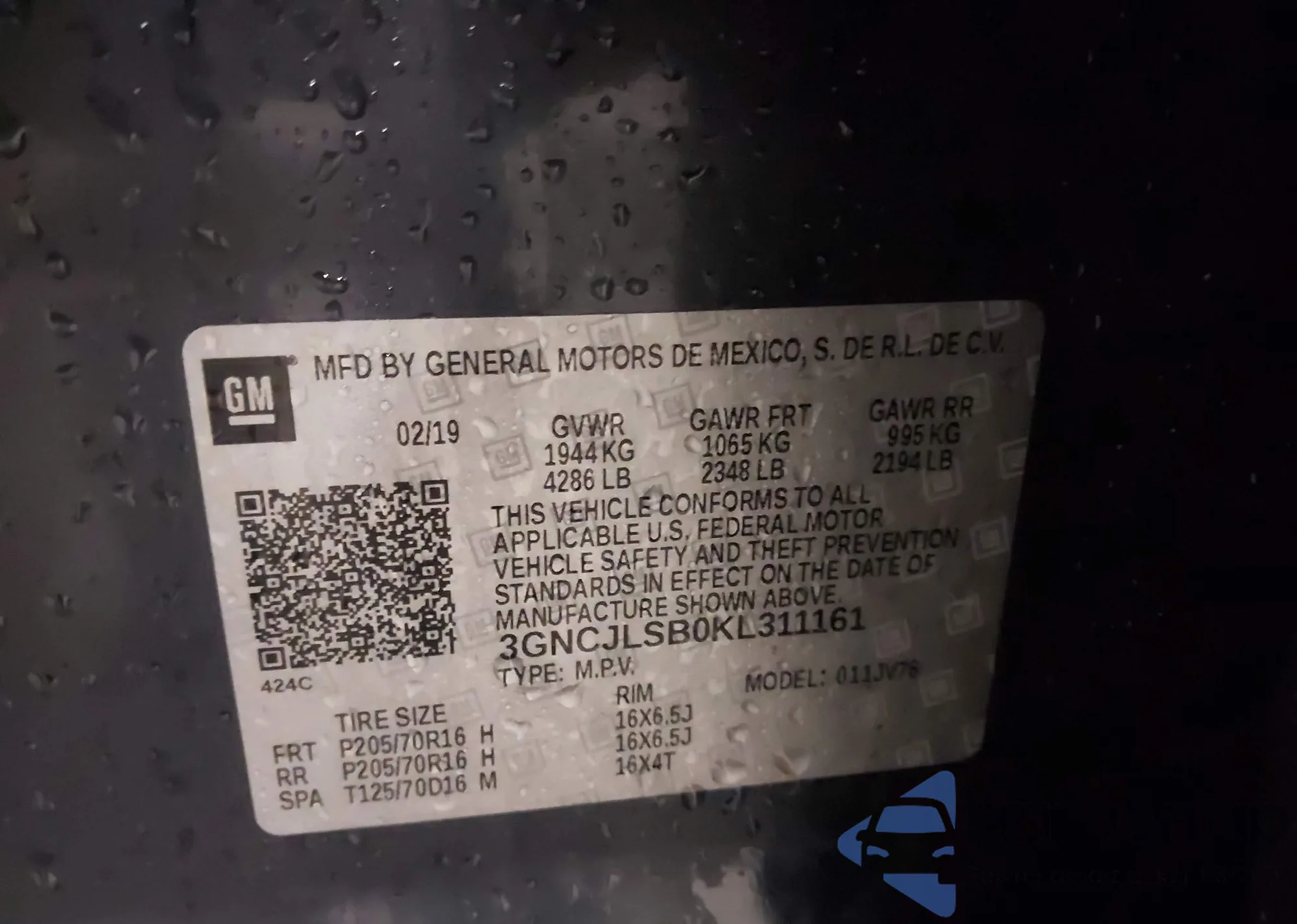 • VIN 3GNCJLSB0KL311161