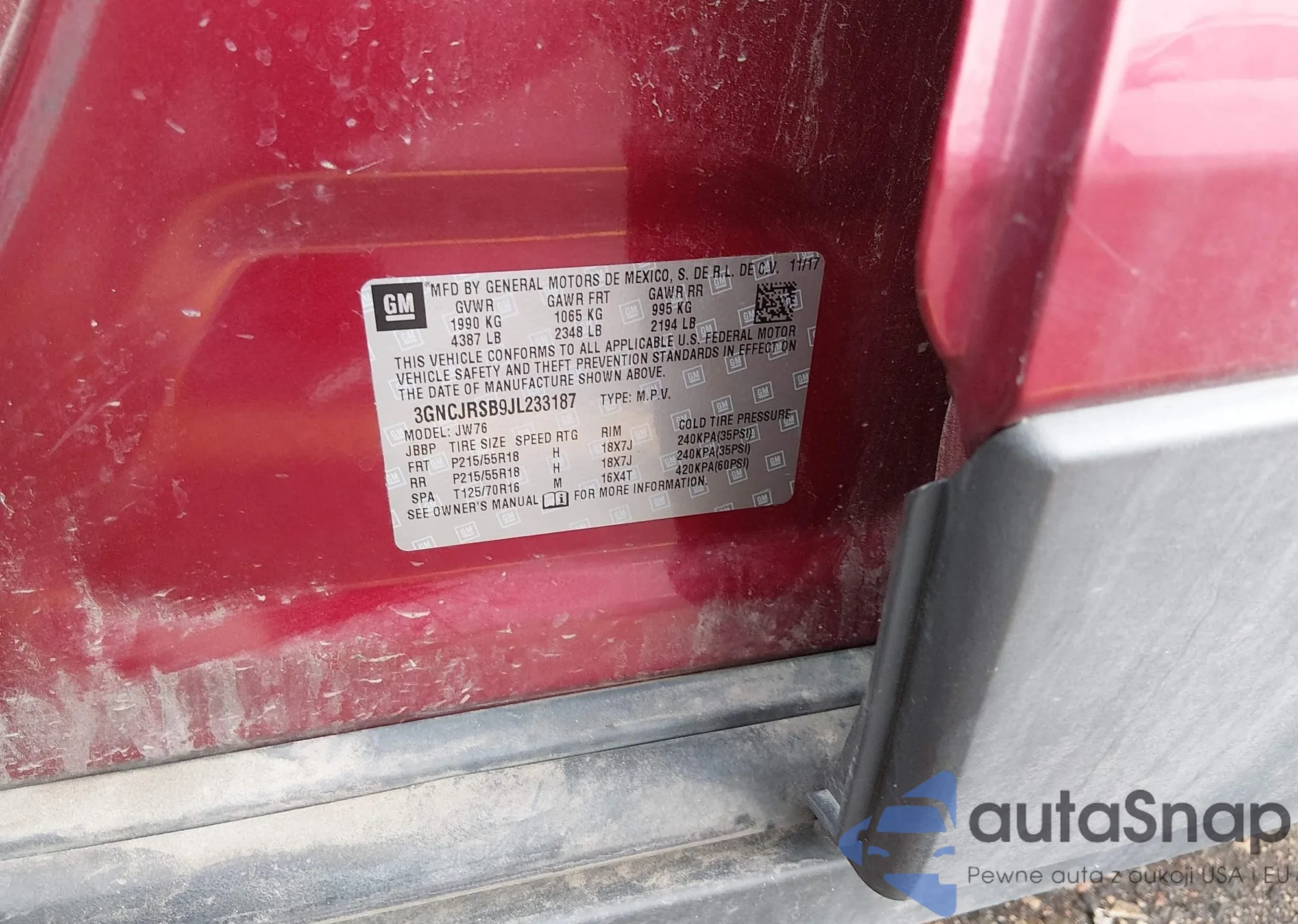 • VIN 3GNCJRSB9JL233187