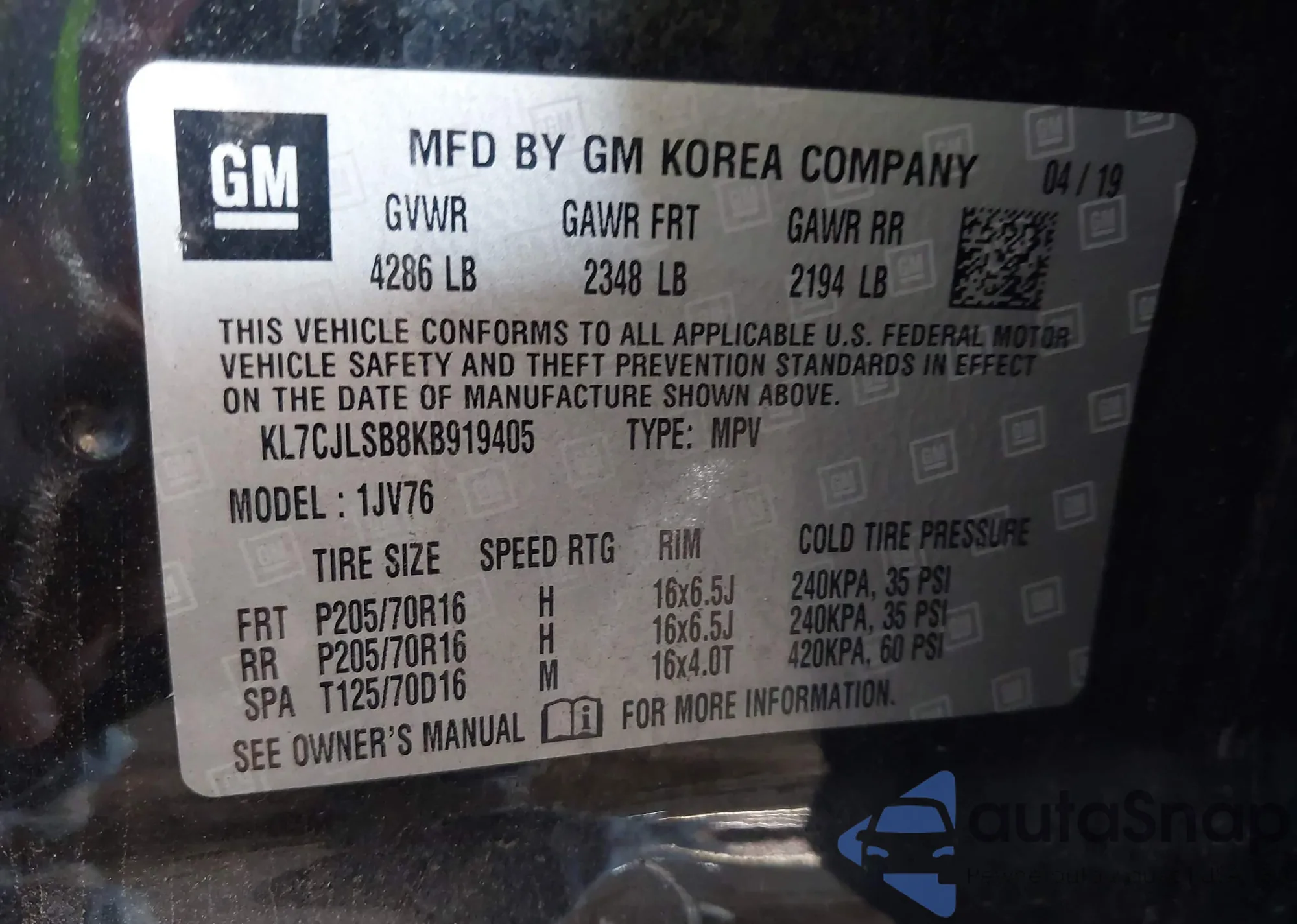 • VIN KL7CJLSB8KB919405