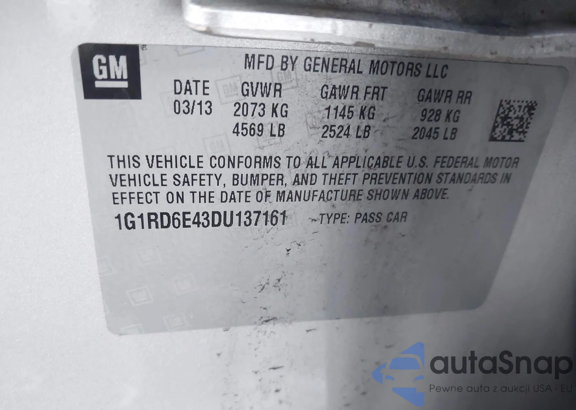 LOT: 43086780 VIN: 1G1RD6E43DU137161