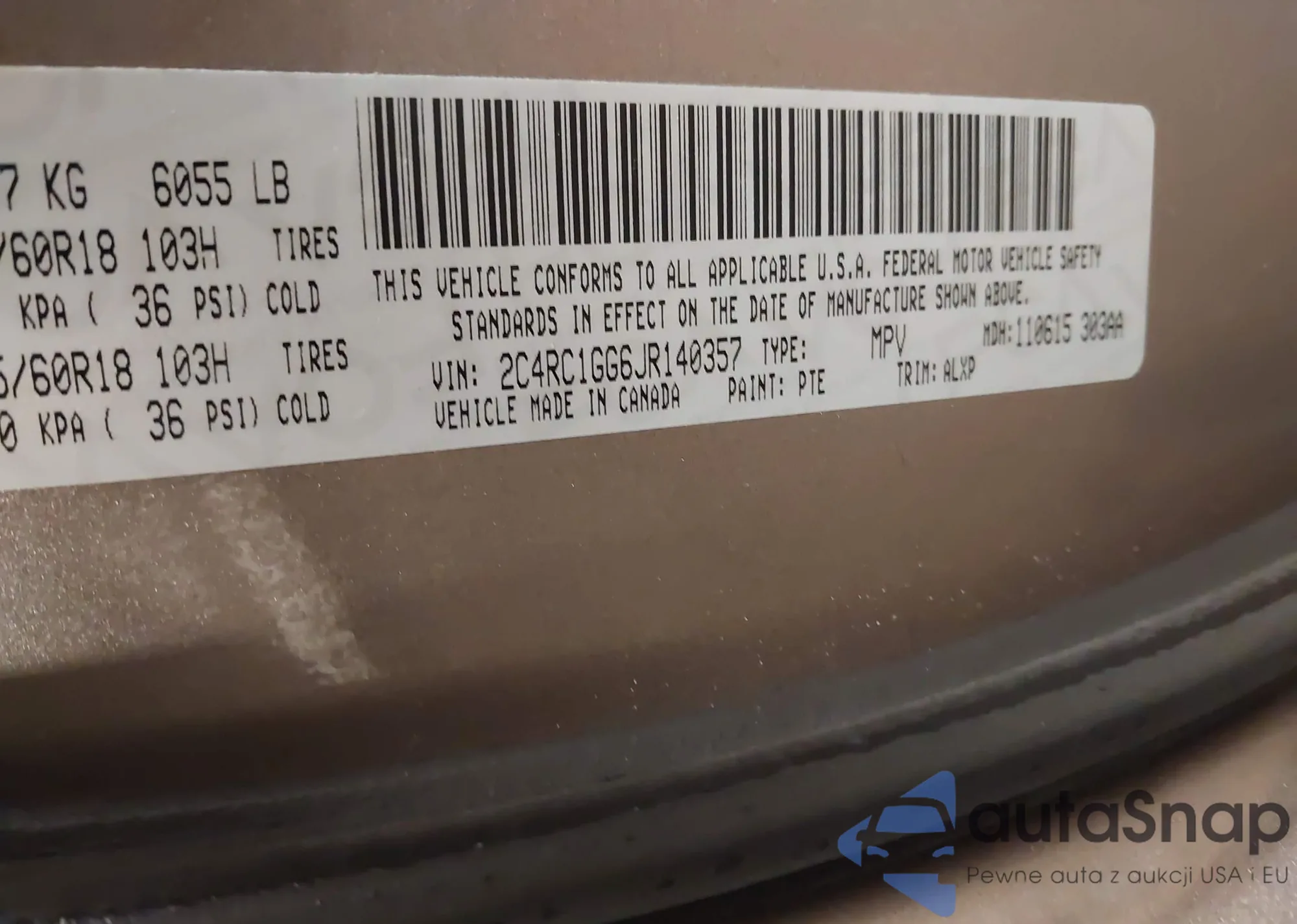 • VIN 2C4RC1GG6JR140357