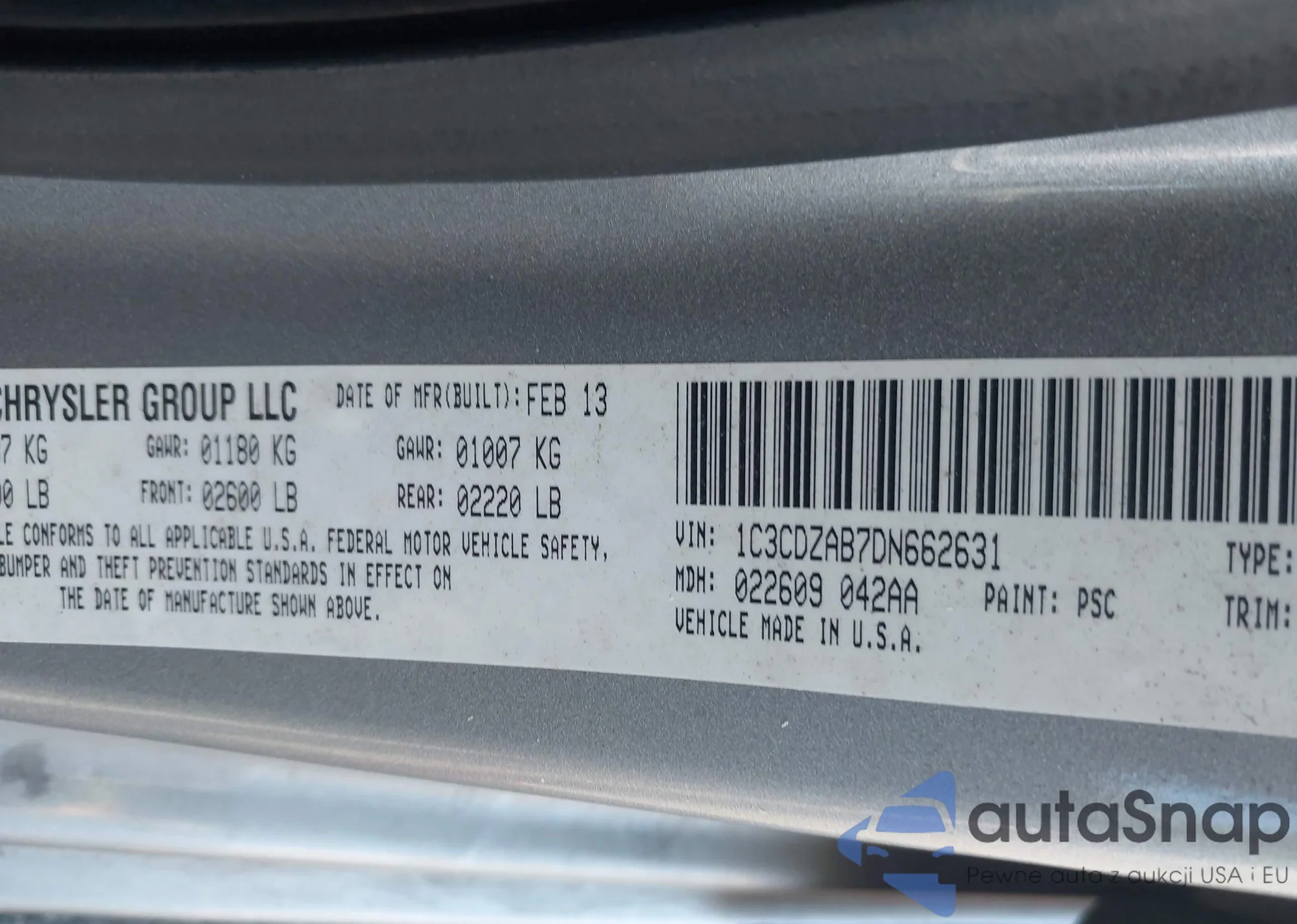 LOT: 44084923 VIN: 1C3CDZAB7DN662631