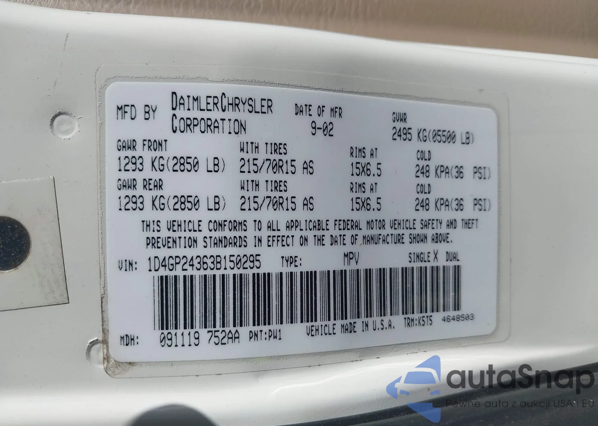 LOT: 43599919 VIN: 1D4GP24363B150295