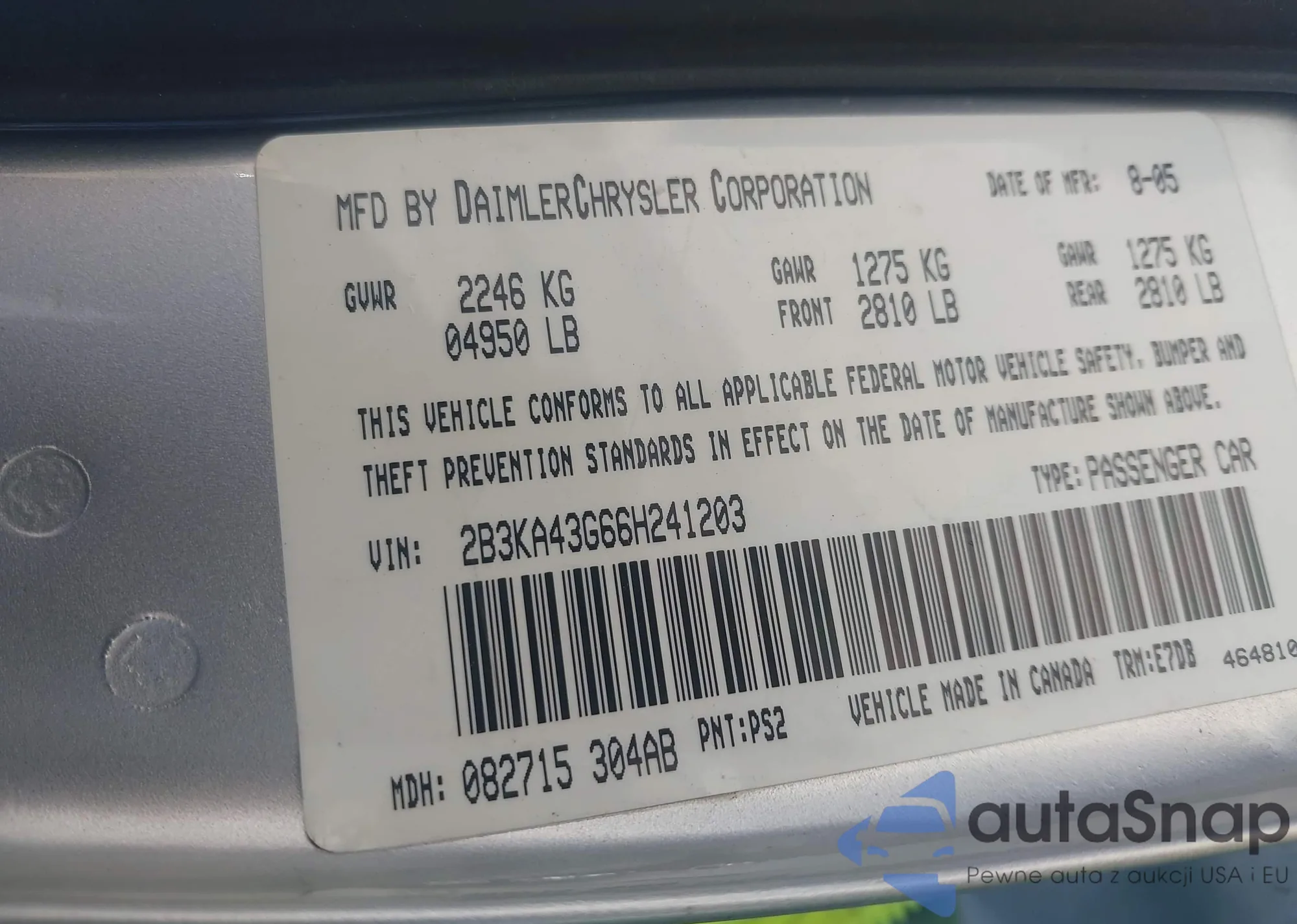 • VIN 2B3KA43G66H241203