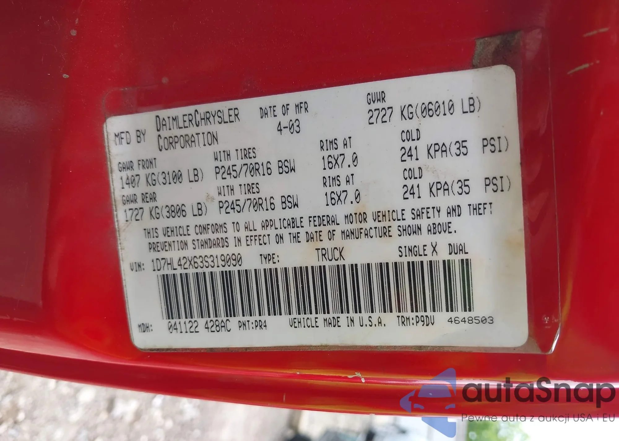 • VIN 1D7HL42X63S319090
