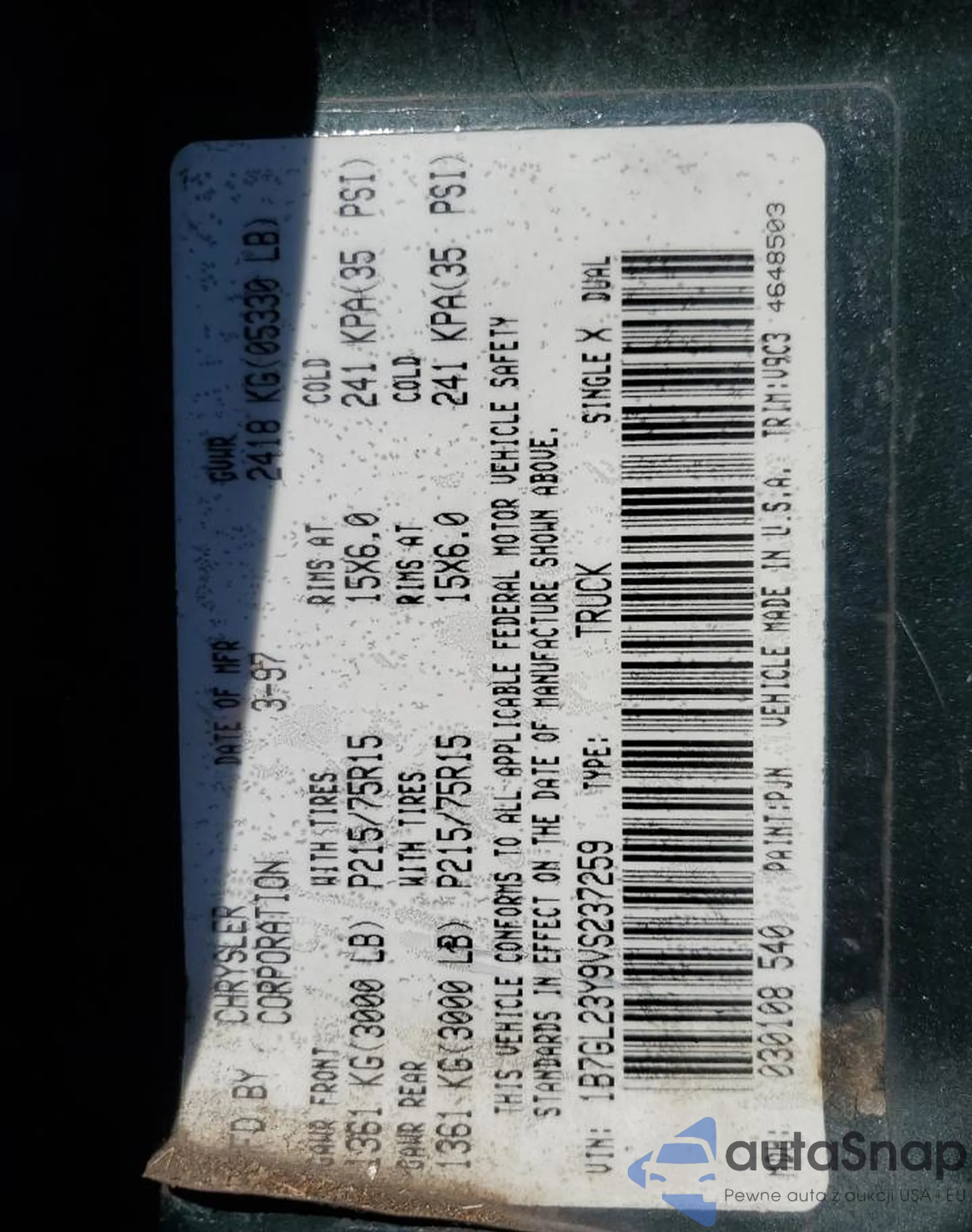 • VIN 1B7GL23Y9VS237259