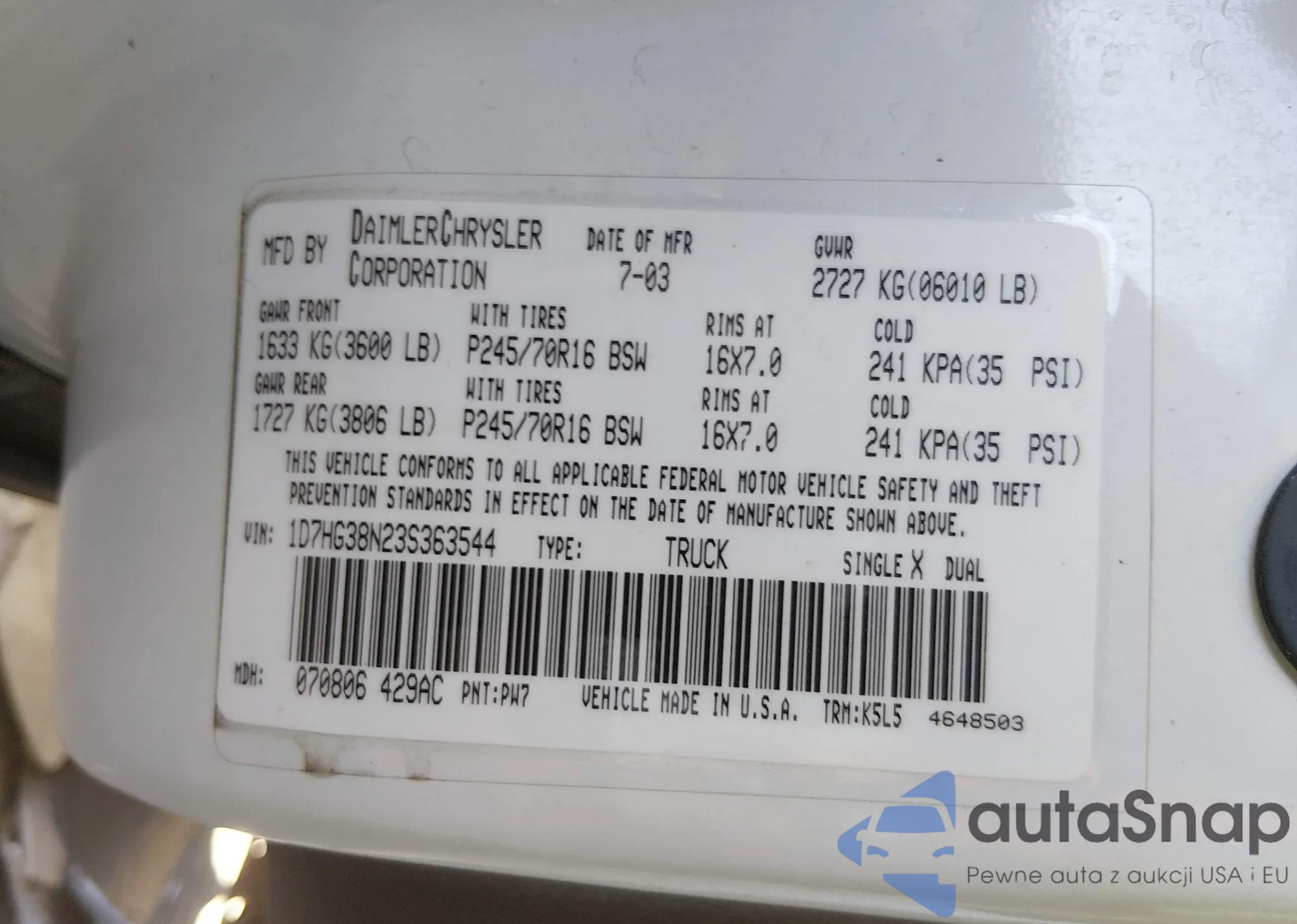• VIN 1D7HG38N23S363544