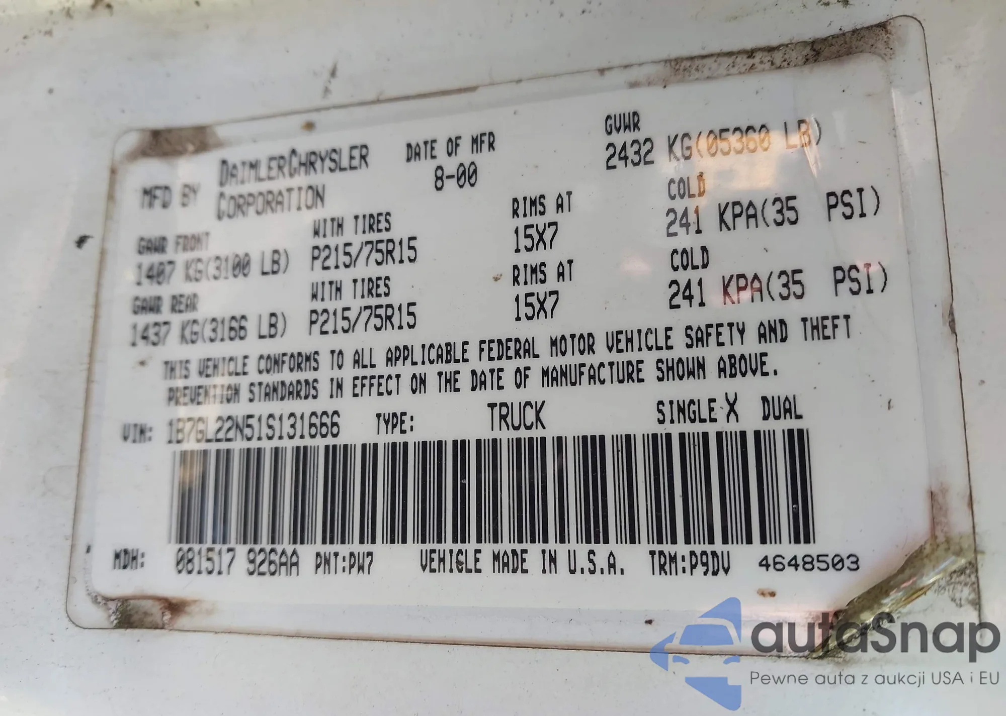 • VIN 1B7GL22N51S131666