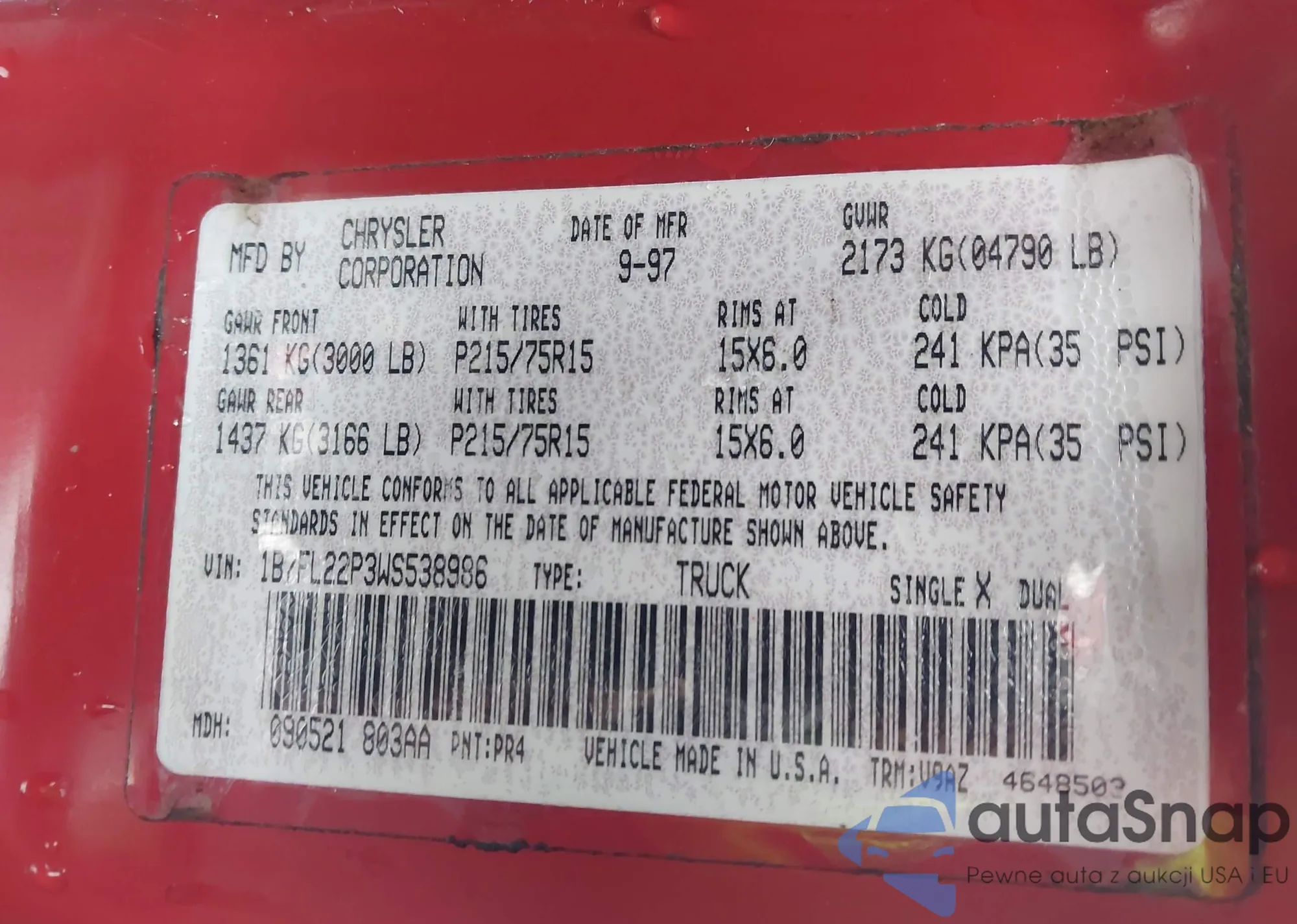 • VIN 1B7FL22P3WS538986