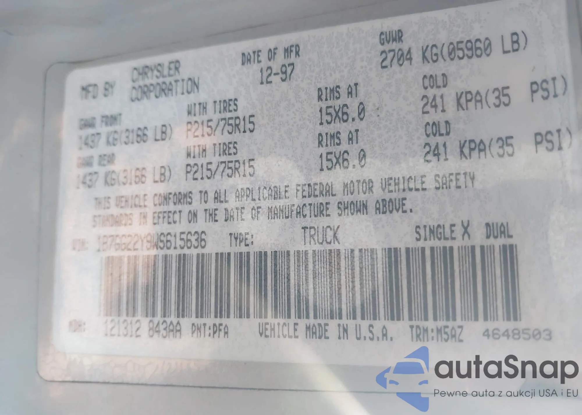 • VIN 1B7GG22Y9WS615636