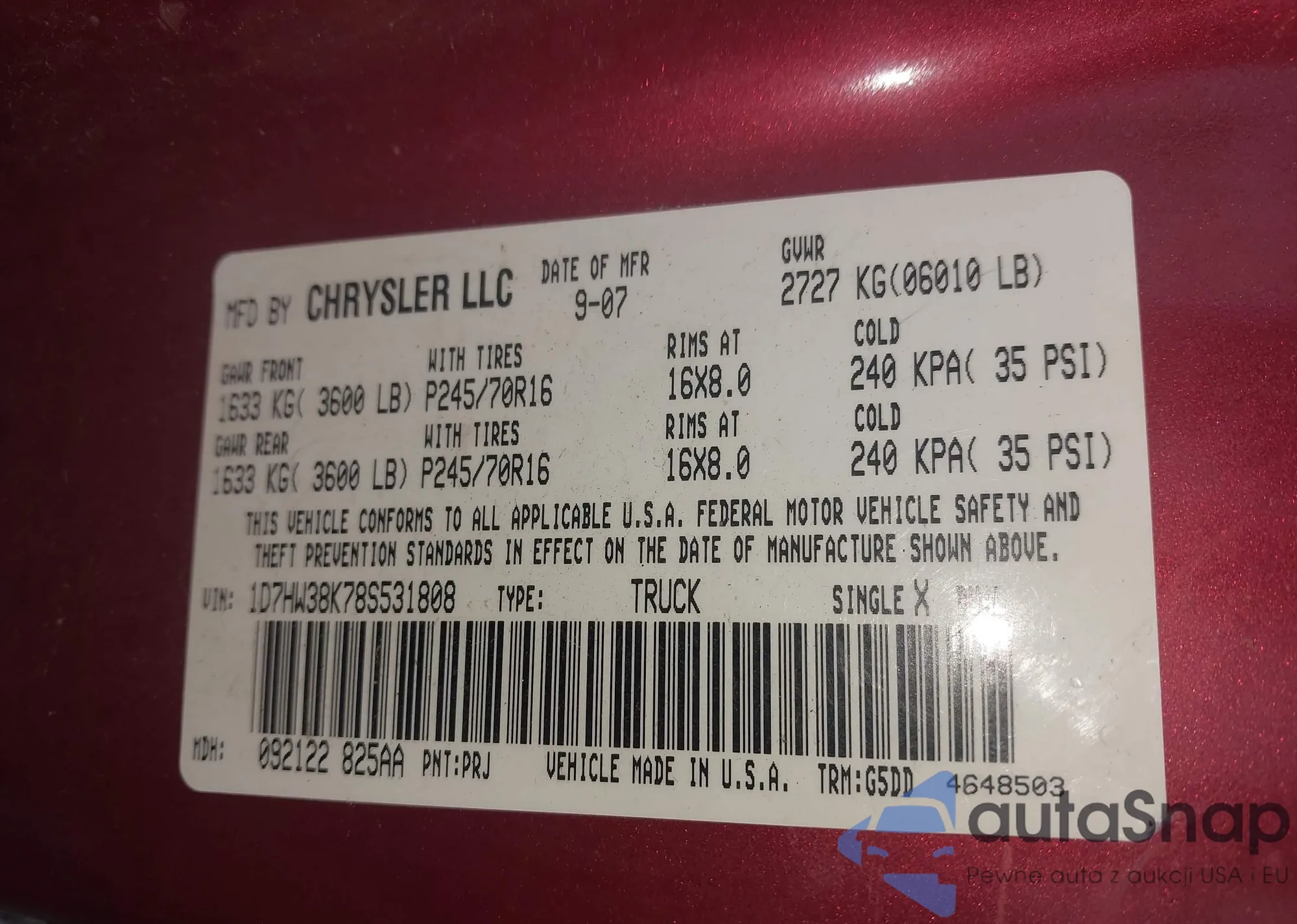 • VIN 1D7HW38K78S531808