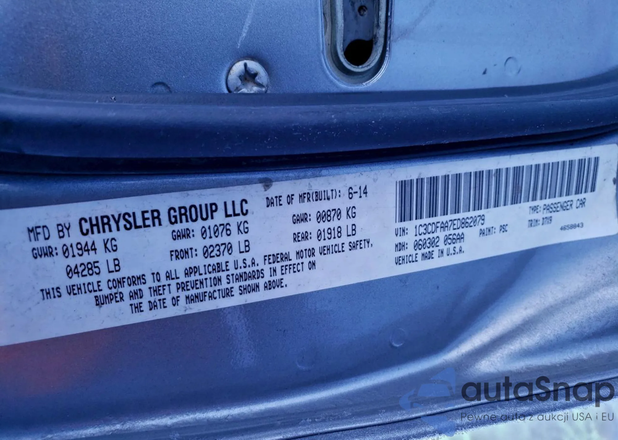 • VIN 1C3CDFAA7ED862079