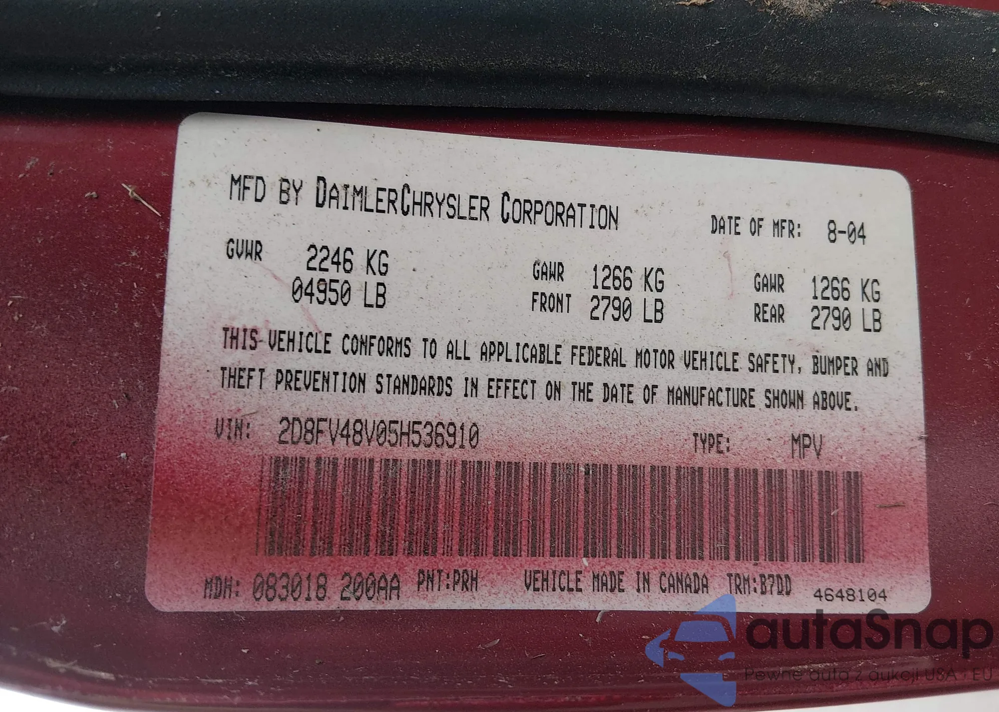 • VIN 2D8FV48V05H536910