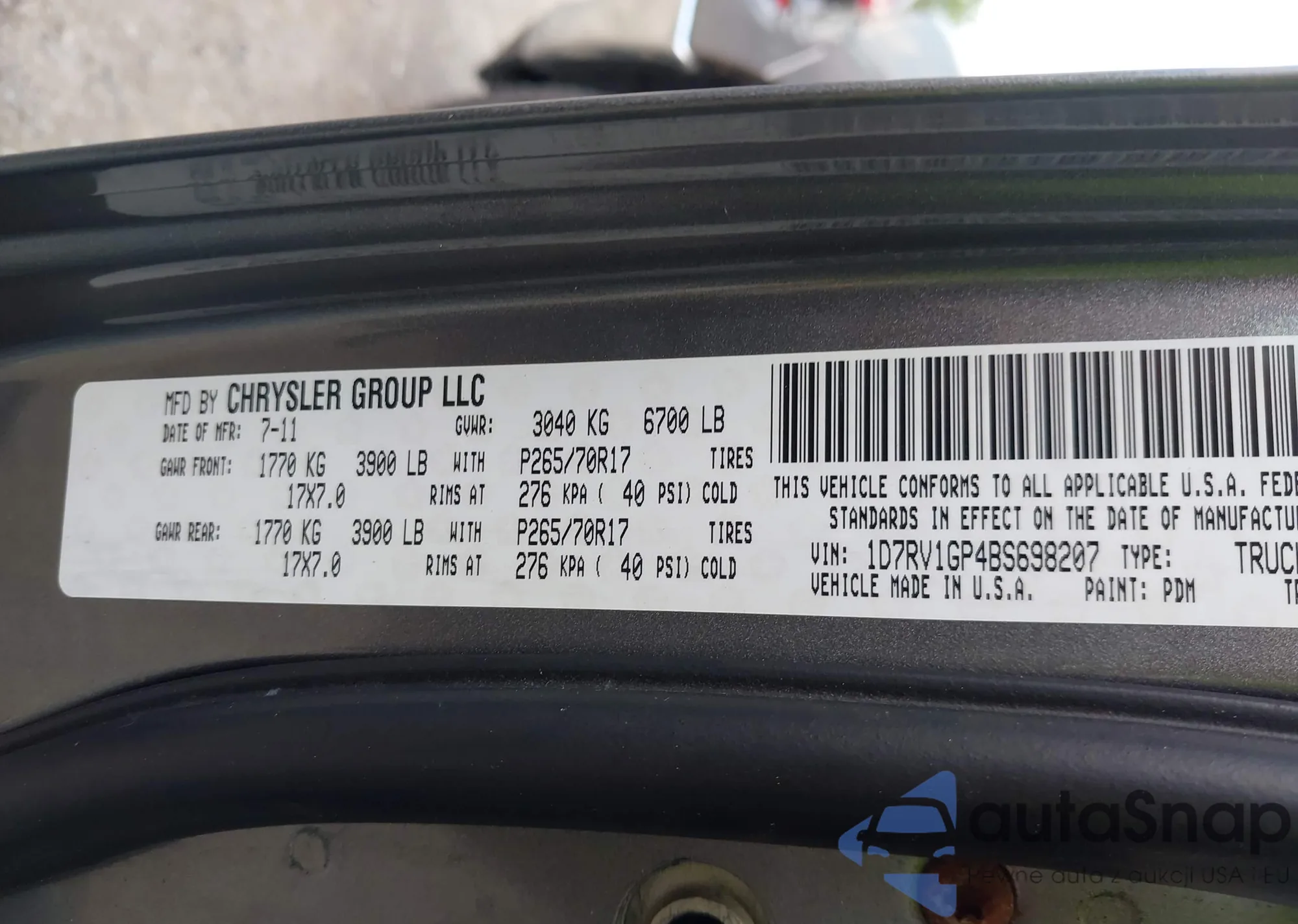 • VIN 1D7RV1GP4BS698207