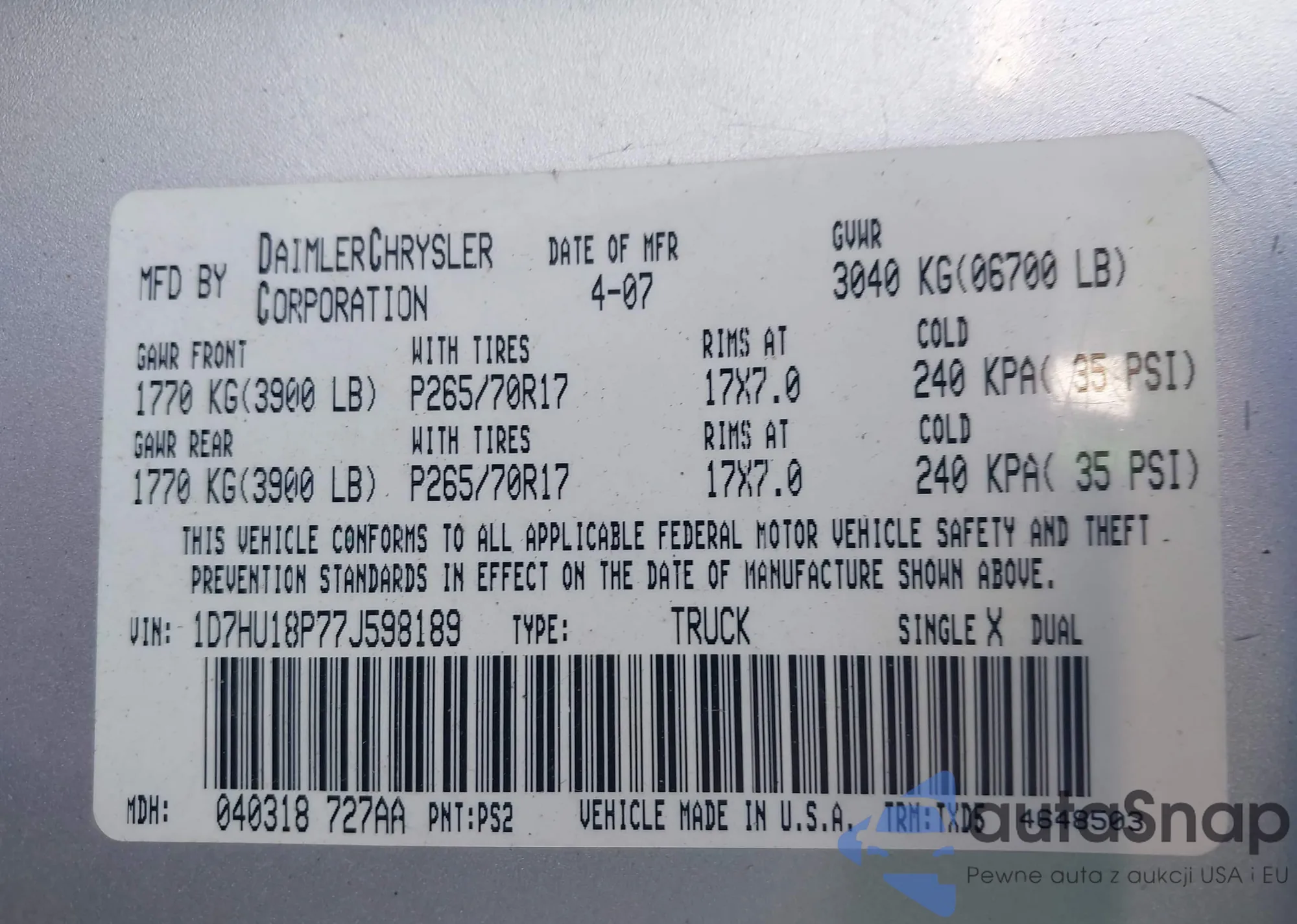 • VIN 1D7HU18P77J598189