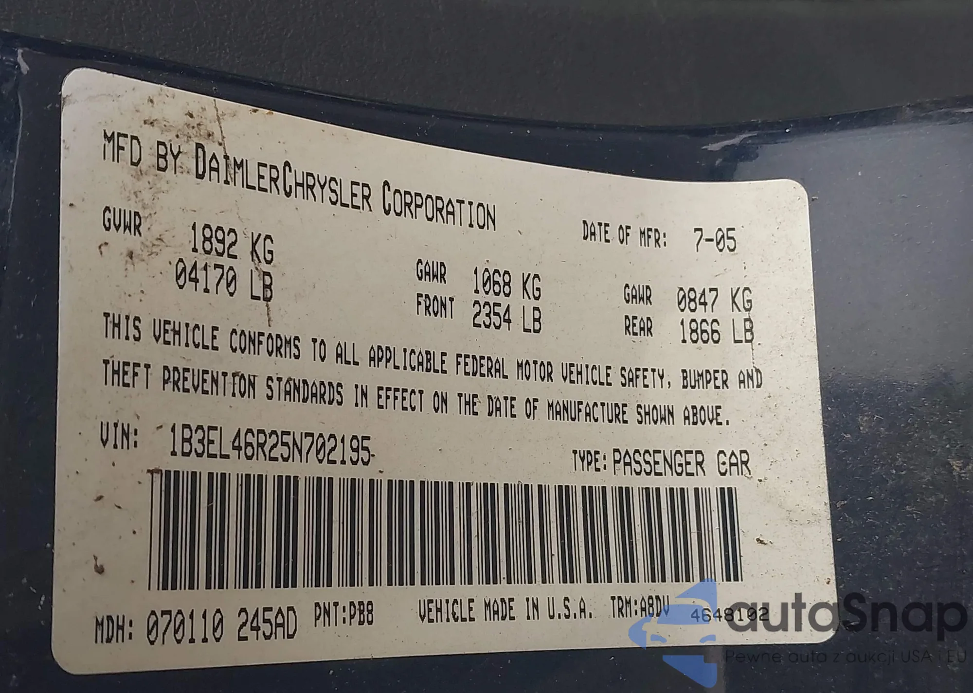 LOT: 93988275 VIN: 1B3EL46T35N568678