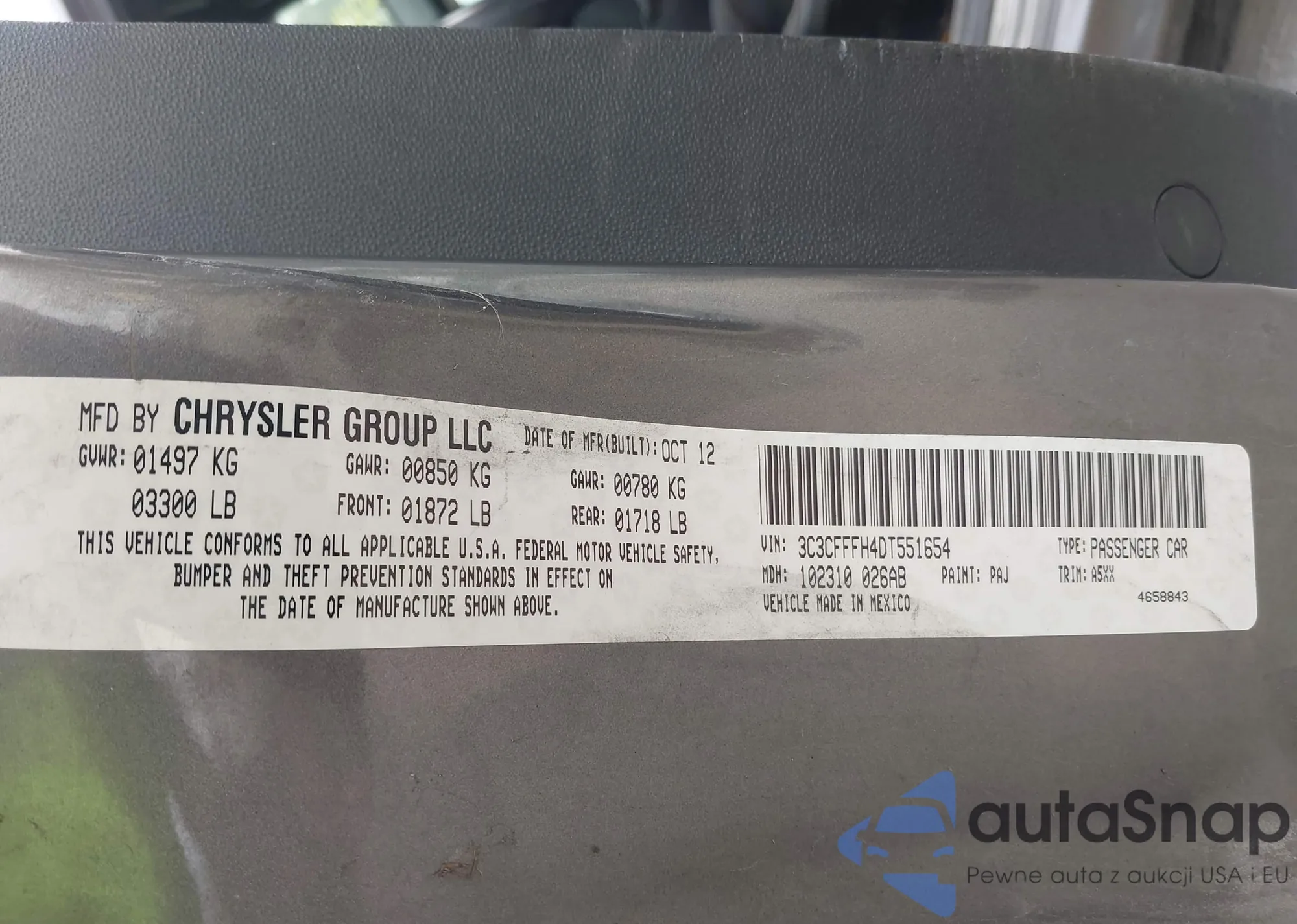 LOT: 43468030 VIN: 3C3CFFFH4DT551654