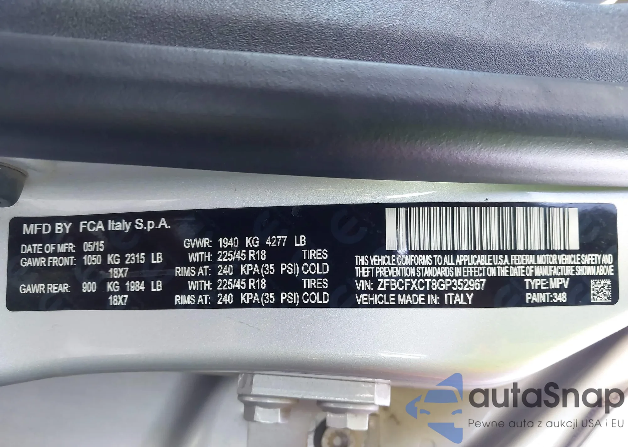 LOT: 43464728 VIN: ZFBCFXBT9GP375918