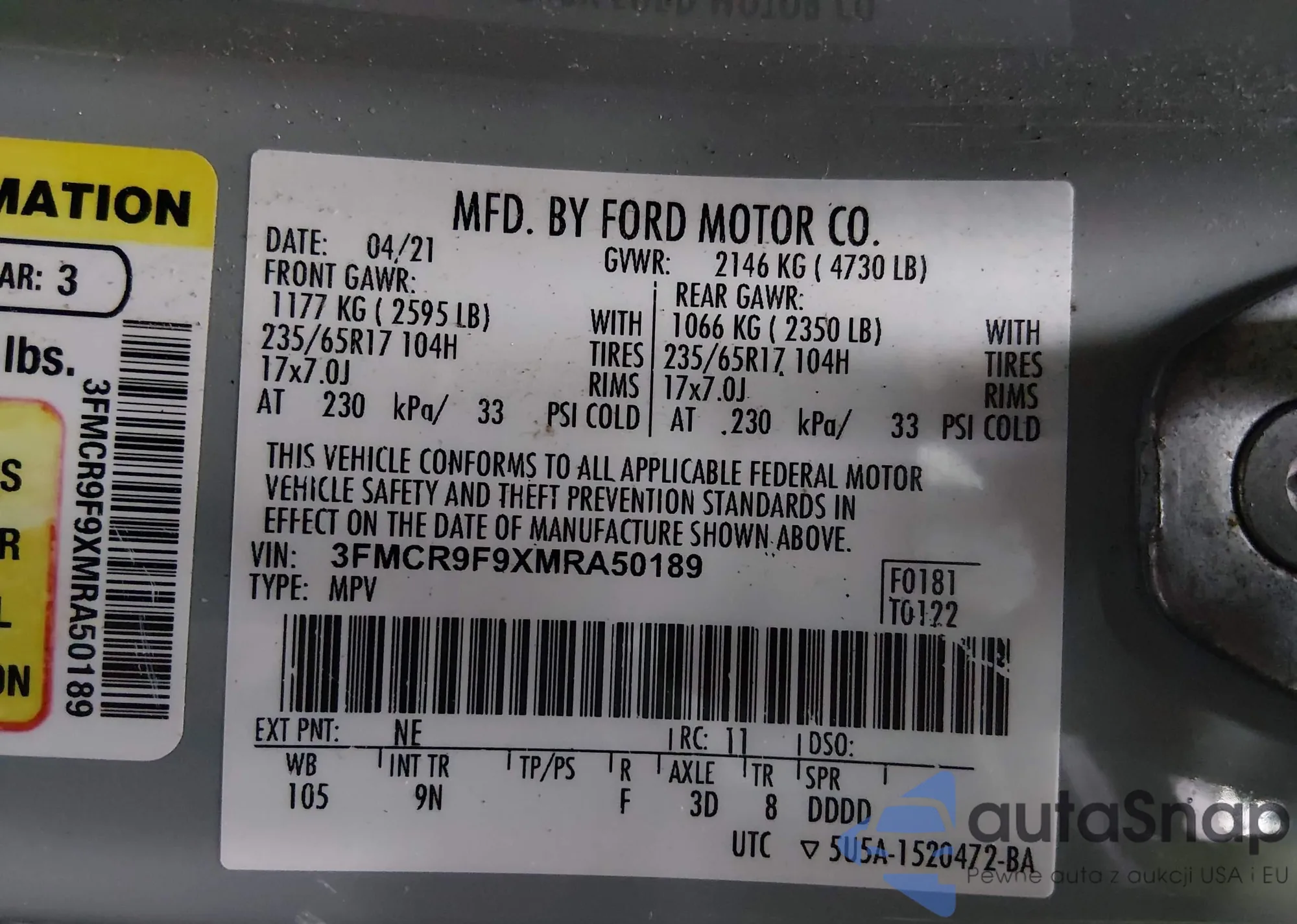 LOT: 43986715 VIN: 3FMCR9D94MRA00553