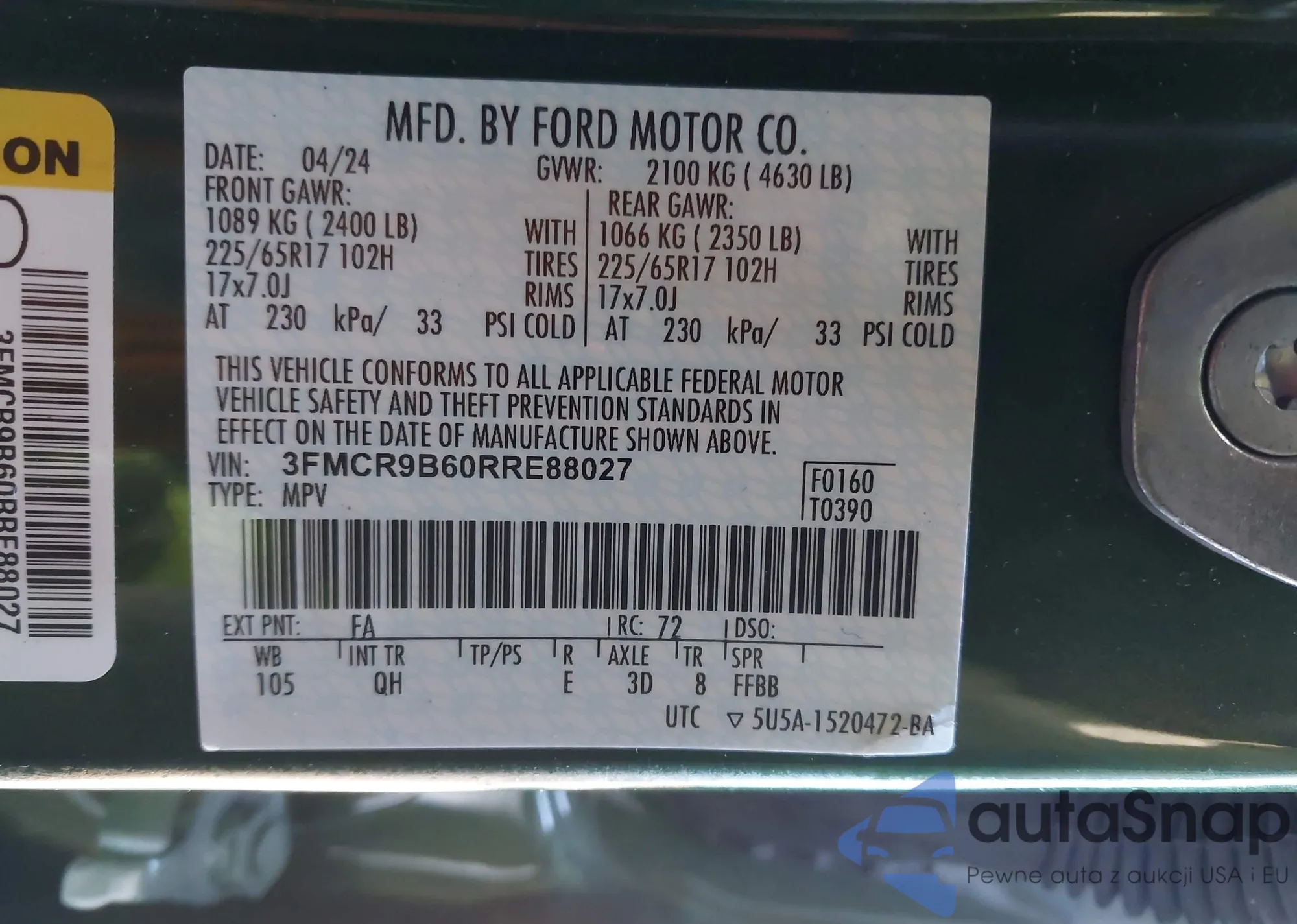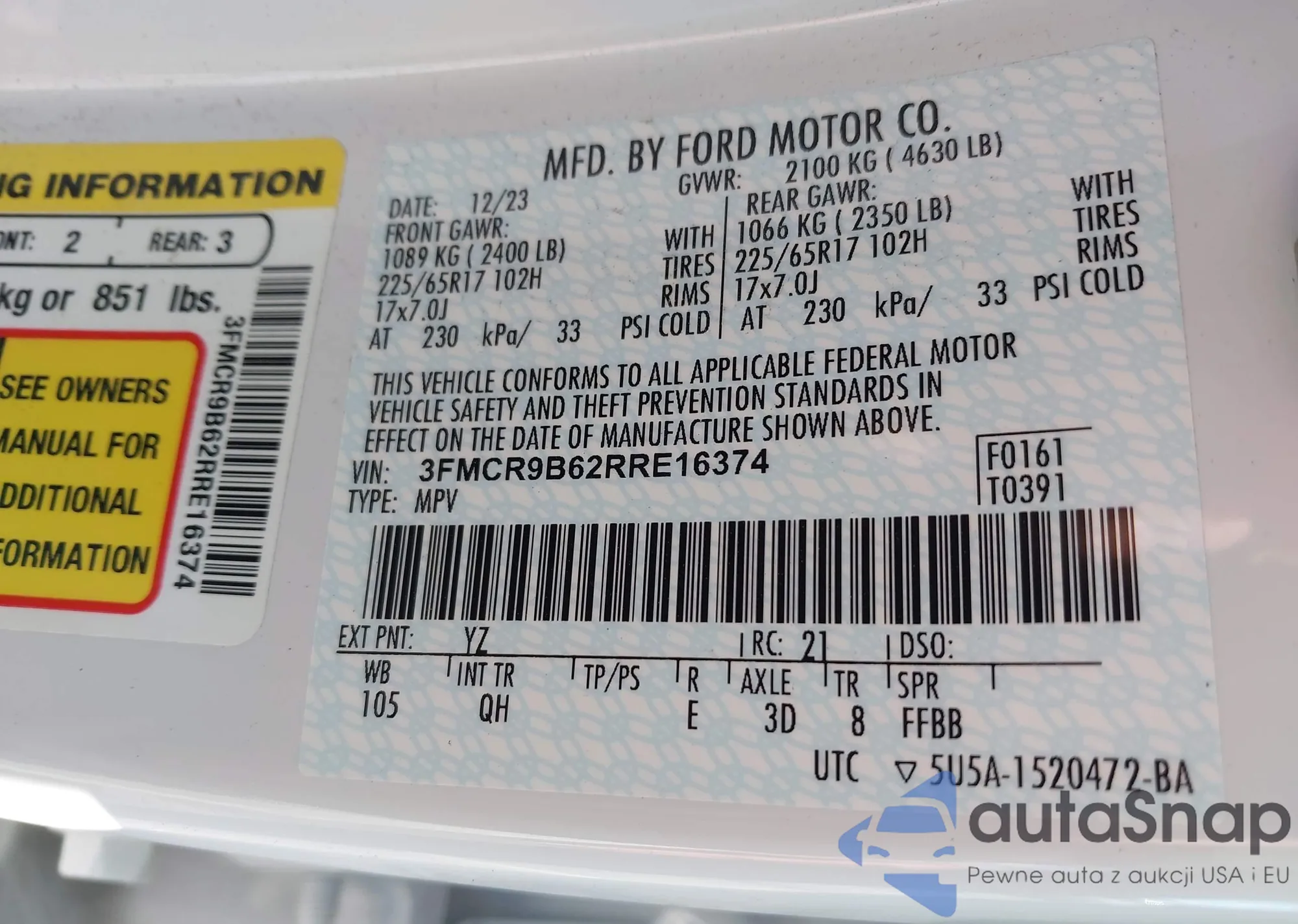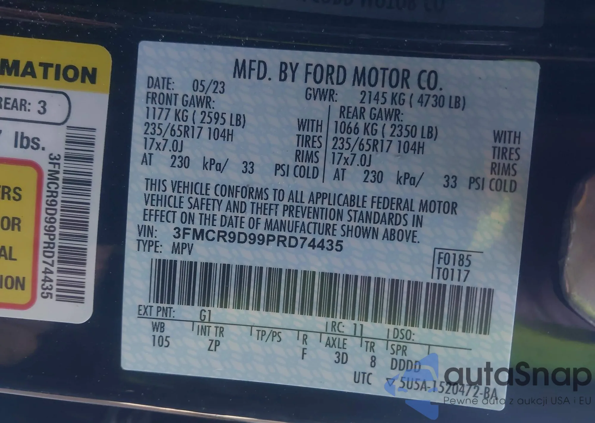 LOT: 98847435 VIN: 3FMCR9B68PRE05165