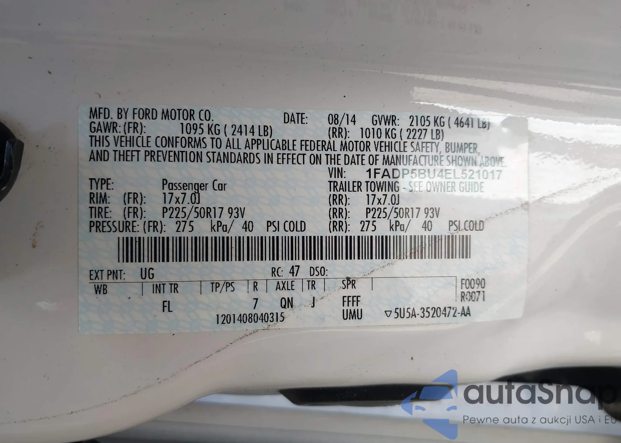 • VIN 1FADP5BU4EL521017