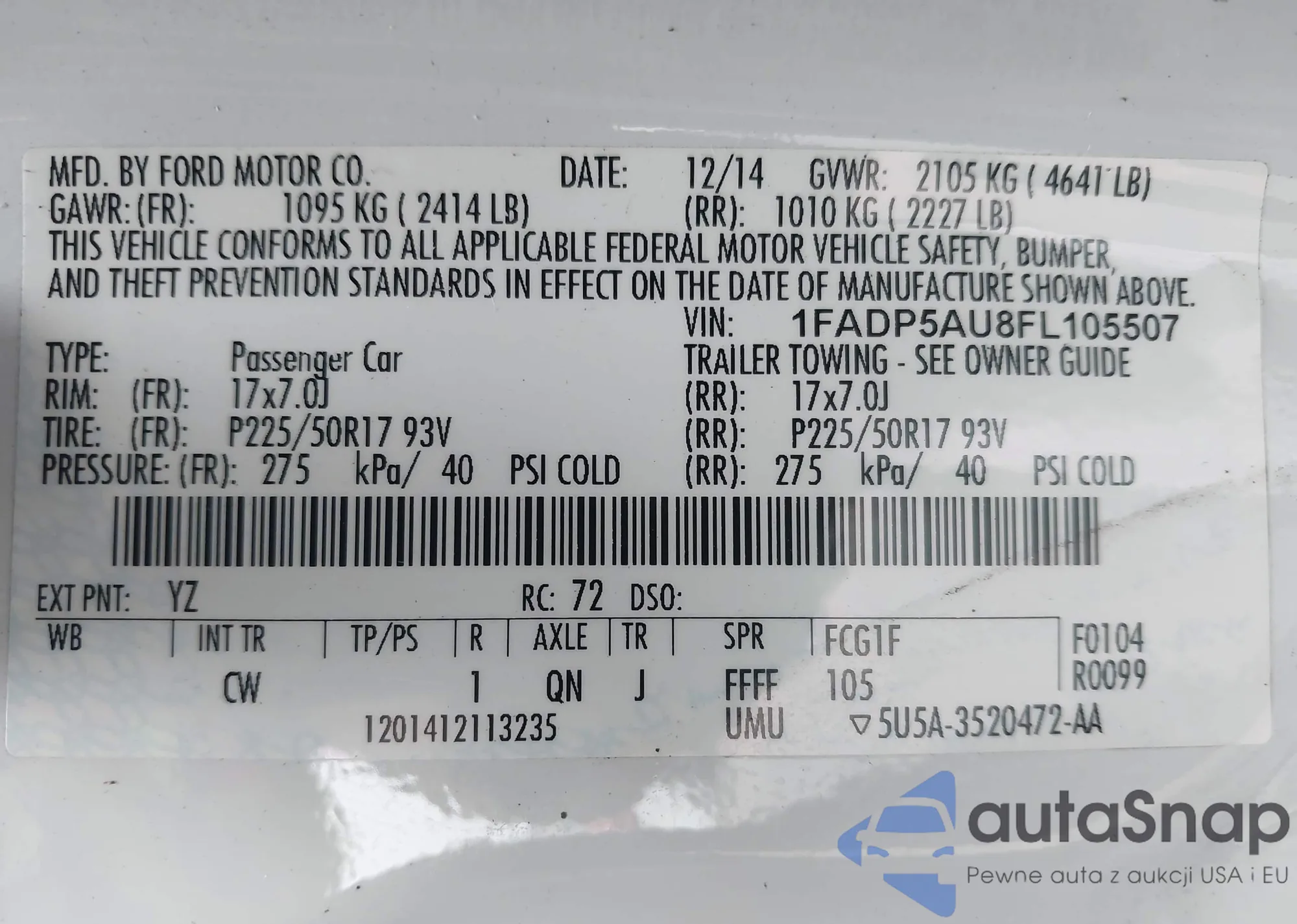 • VIN 1FADP5AU8FL105507