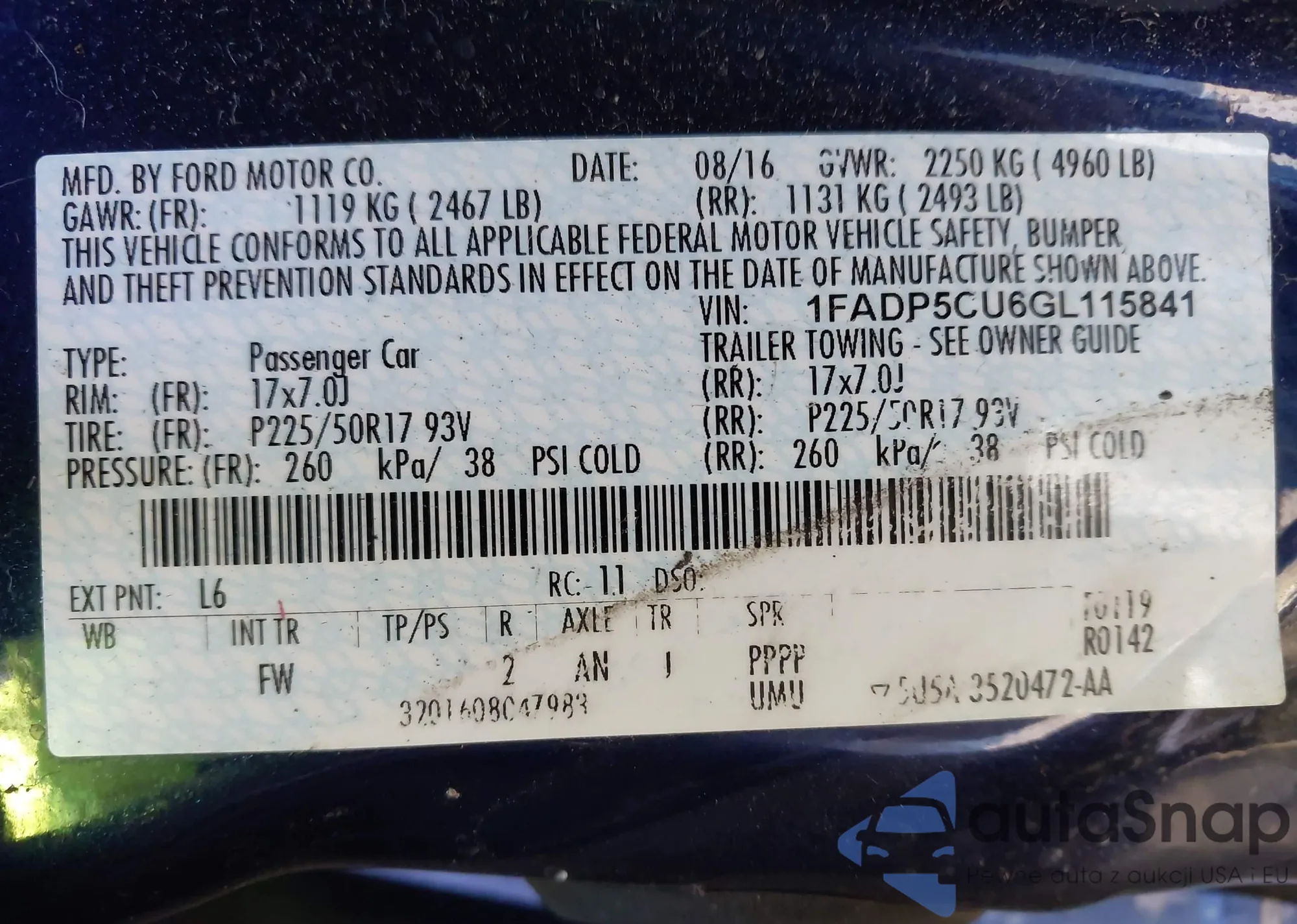 LOT: 43928290 VIN: 1FADP5CU6GL115841