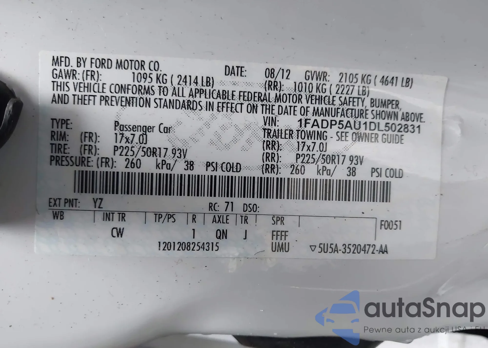 LOT: 43813058 VIN: 1FADP5AU1DL502831
