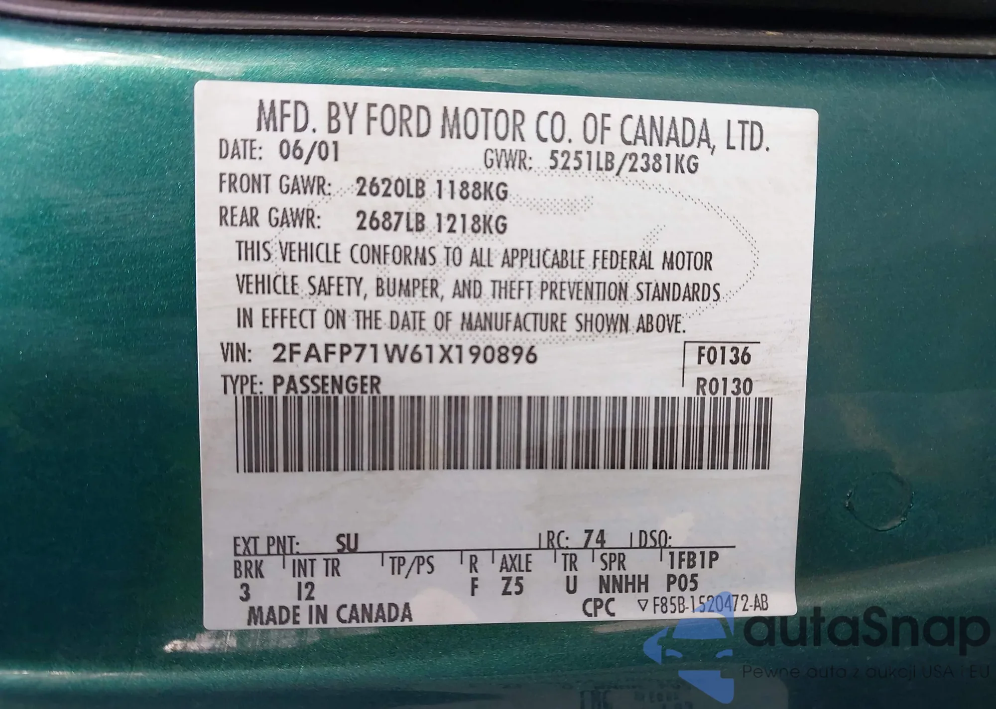 • VIN 2FAFP71W61X190896