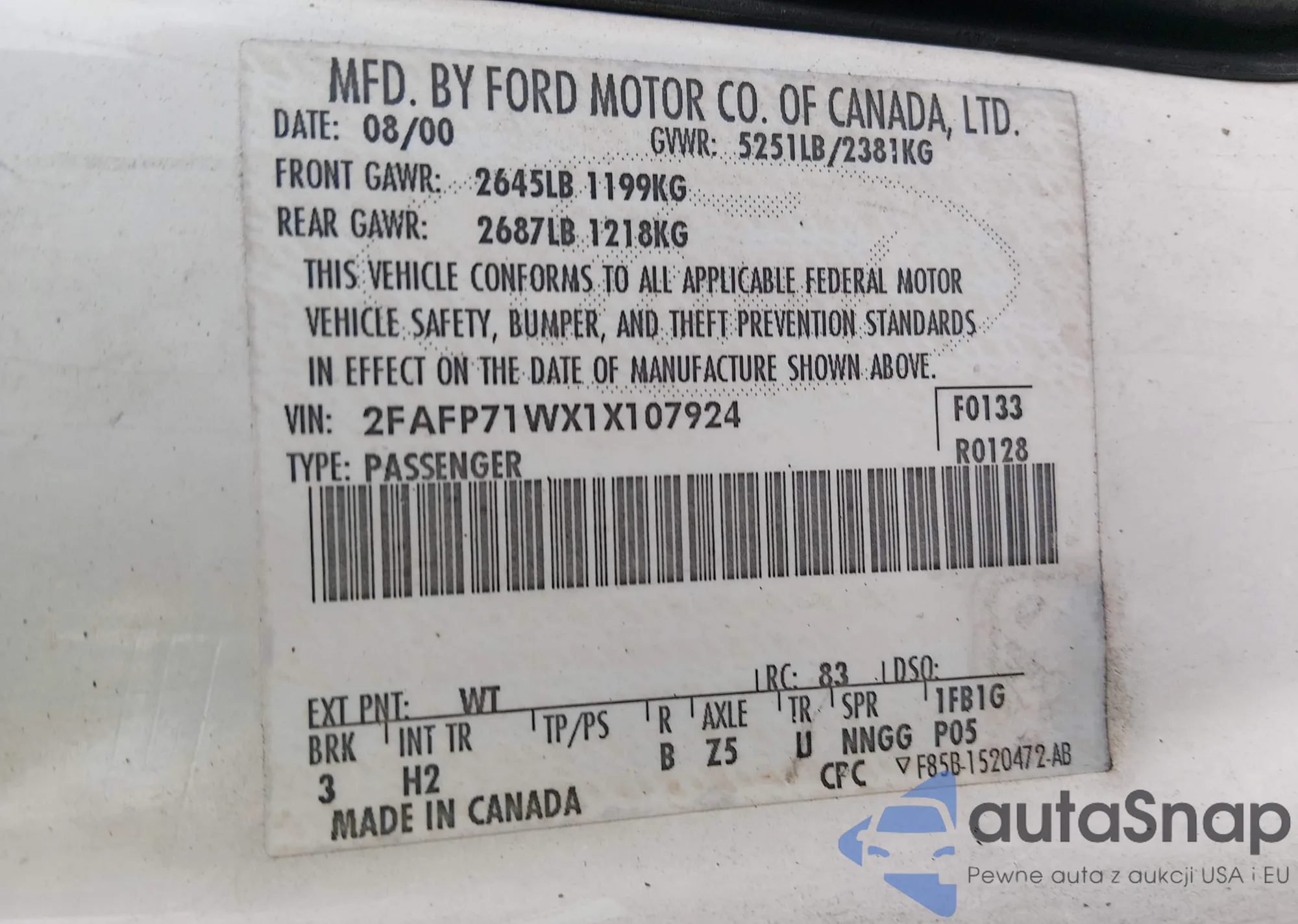 • VIN 2FAFP71WX1X107924