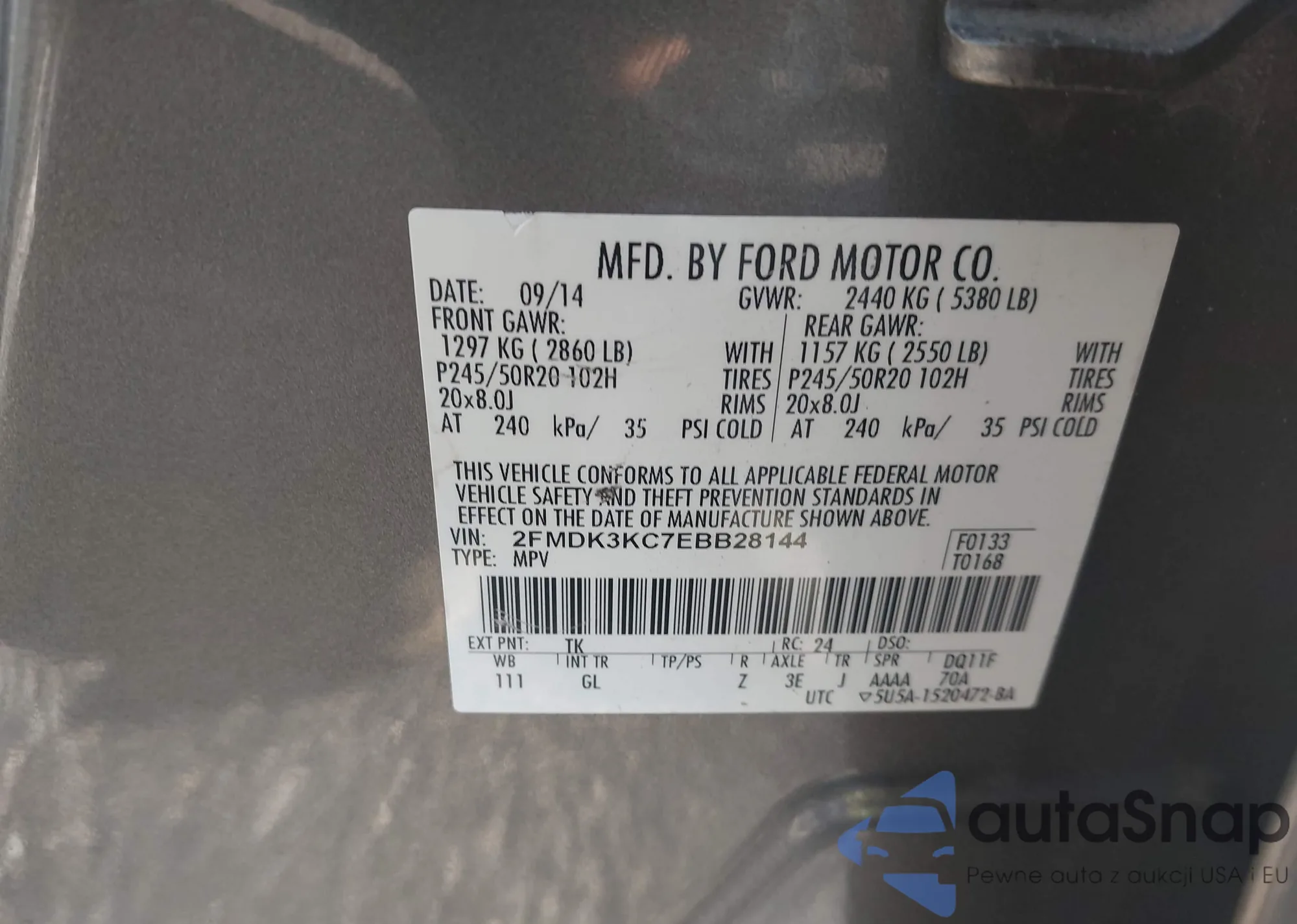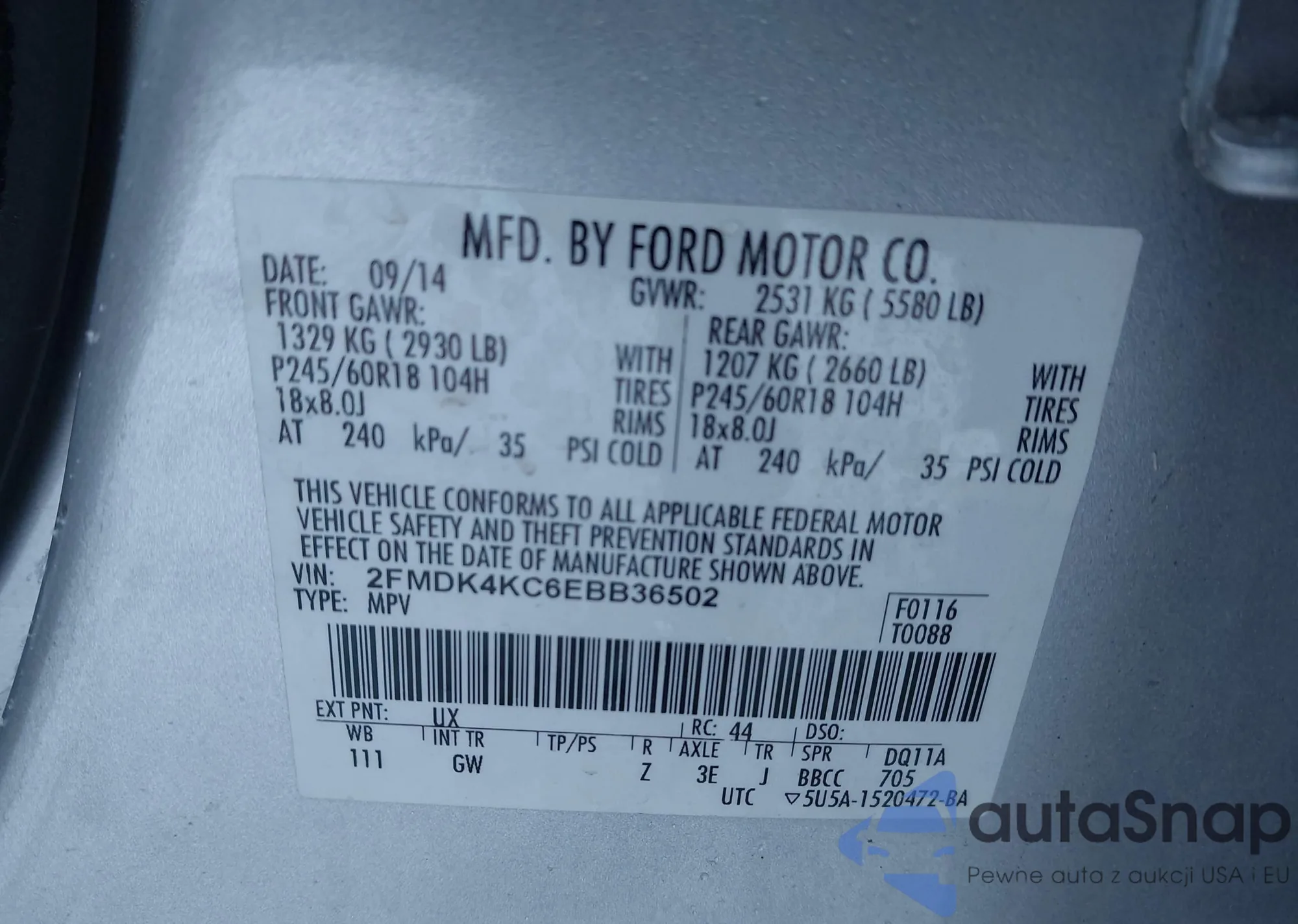 LOT: 44044655 VIN: 2FMDK4KC6EBB36502
