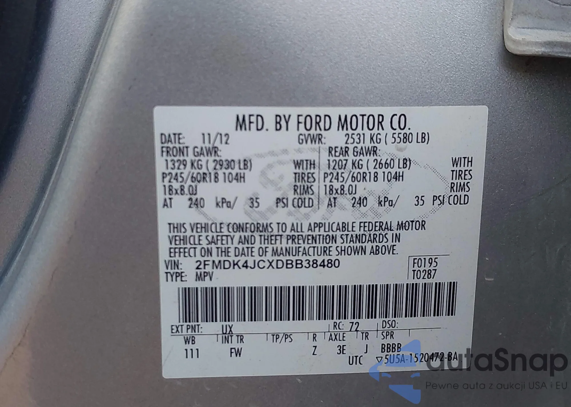 LOT: 43956155 VIN: 2FMDK4JCXDBB38480