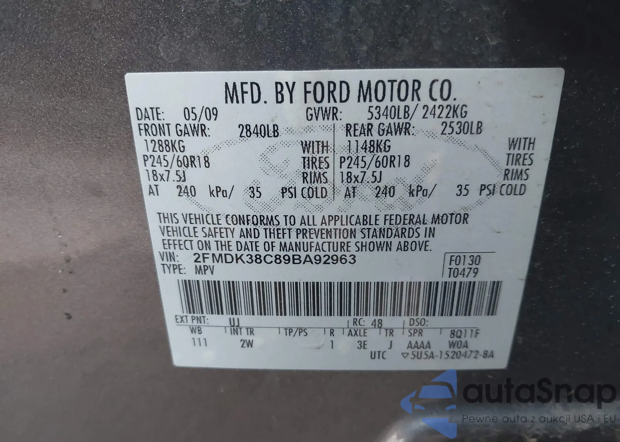 • VIN 2FMDK38C89BA92963