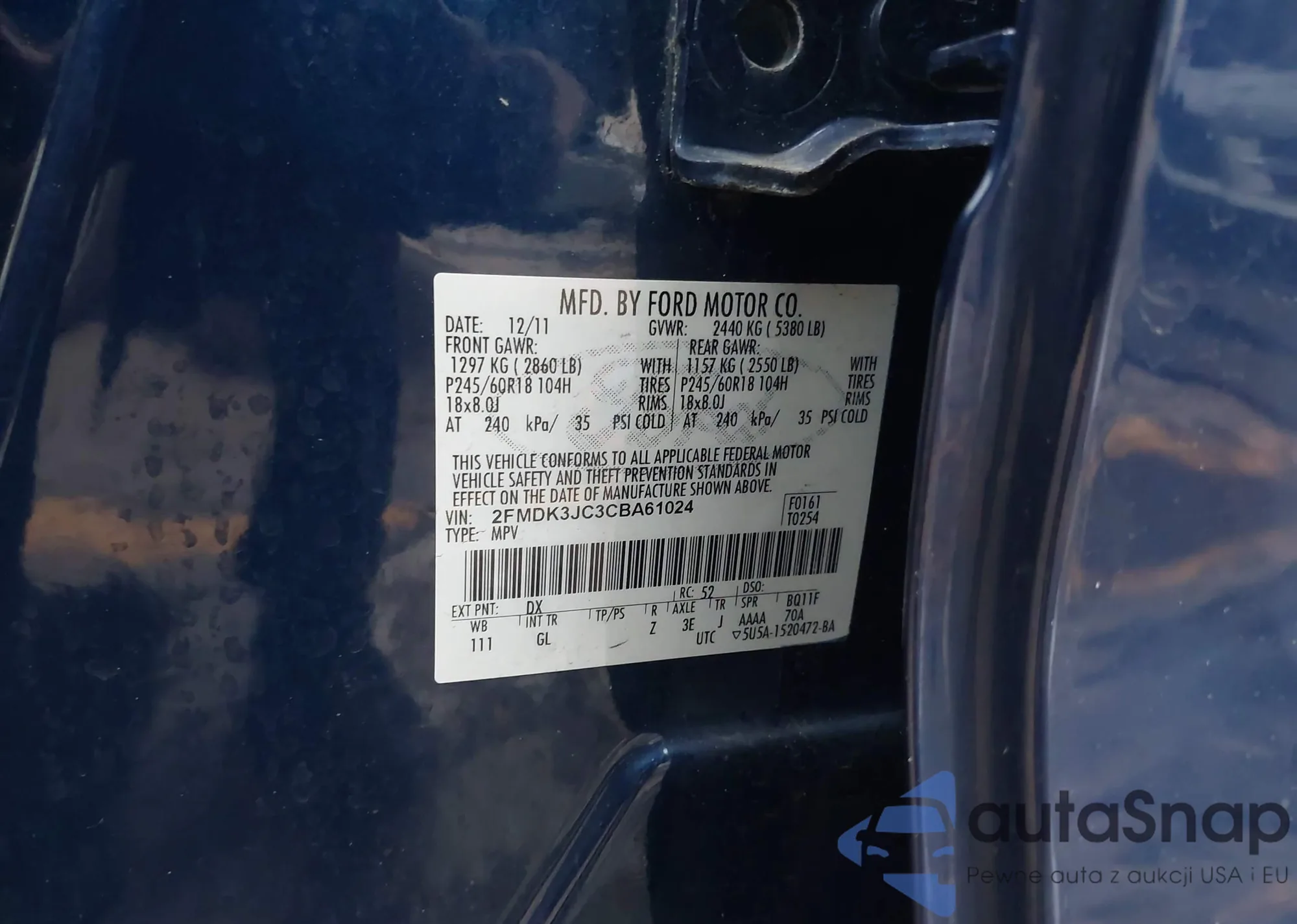 LOT: 44092687 VIN: 2FMDK3JC3CBA61024