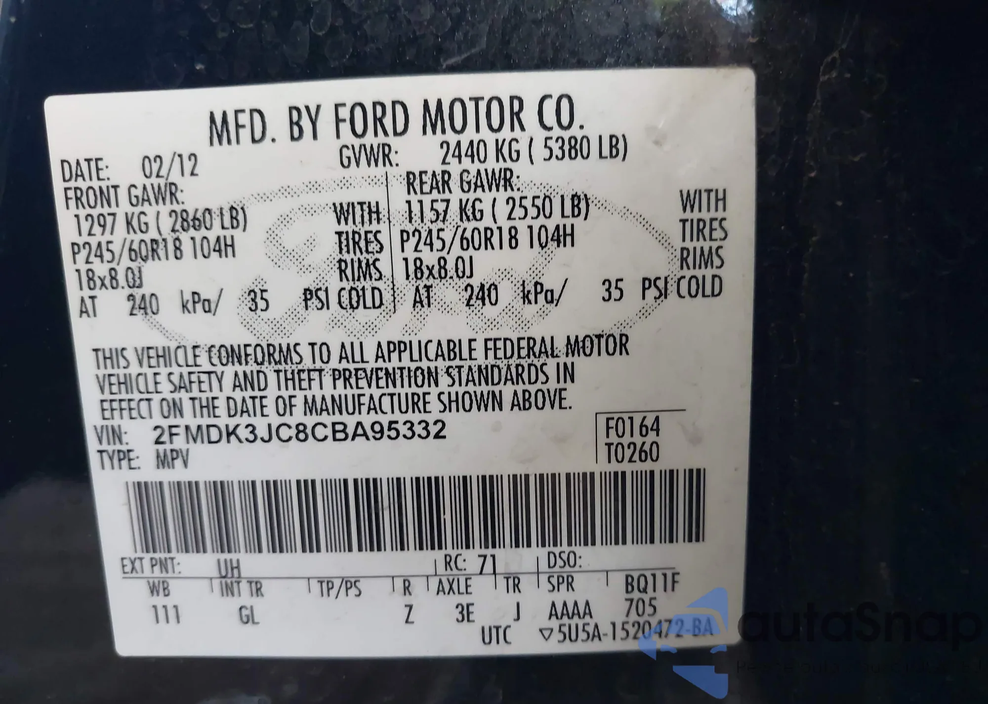 • VIN 2FMDK3JC8CBA95332