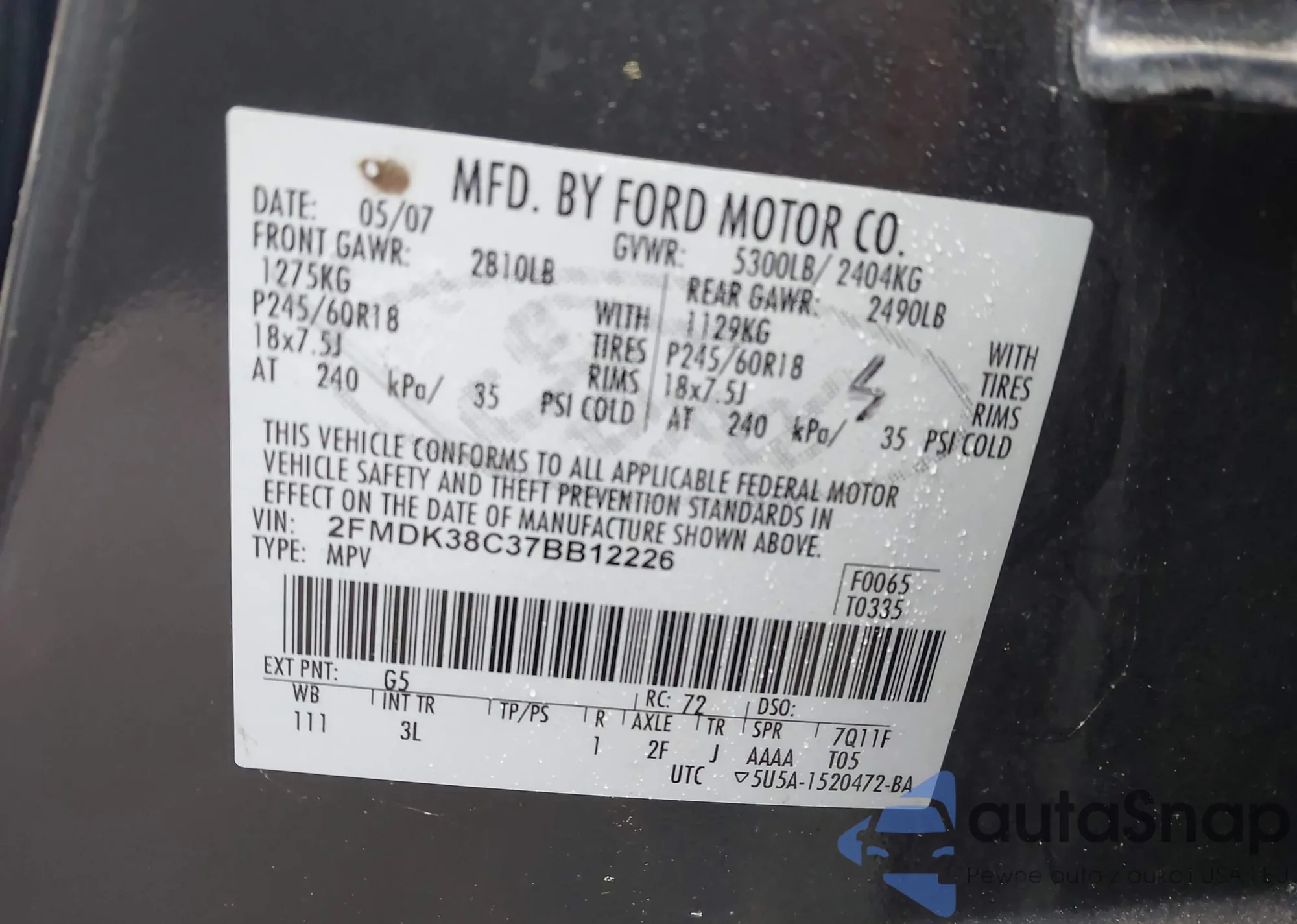 • VIN 2FMDK38C37BB12226