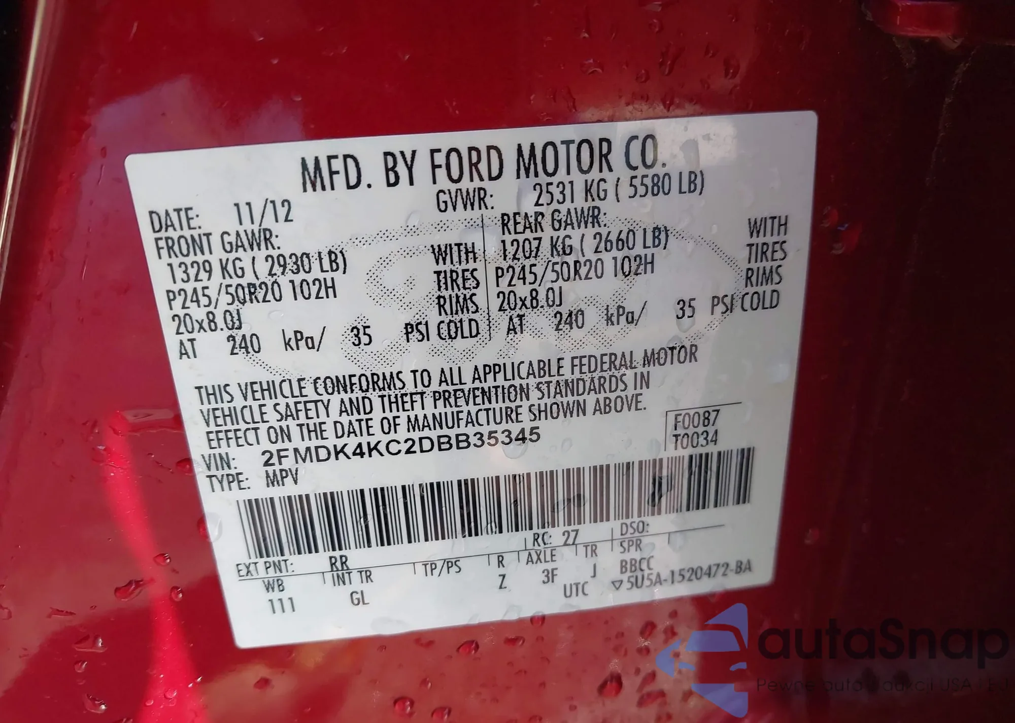 LOT: 44258091 VIN: 2FMDK4KC2DBB35345