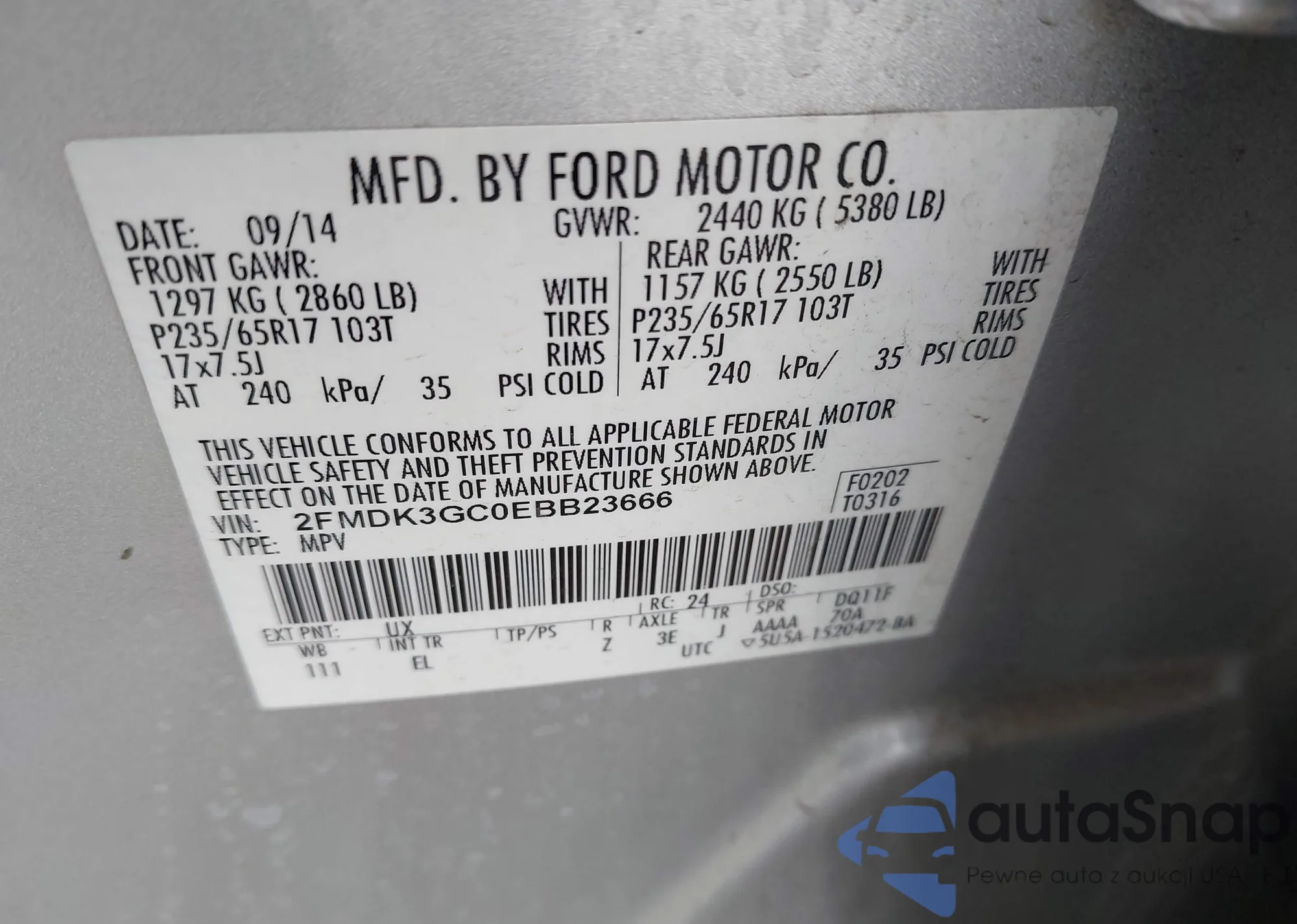 LOT: 44327659 VIN: 2FMDK3GC0EBB23666