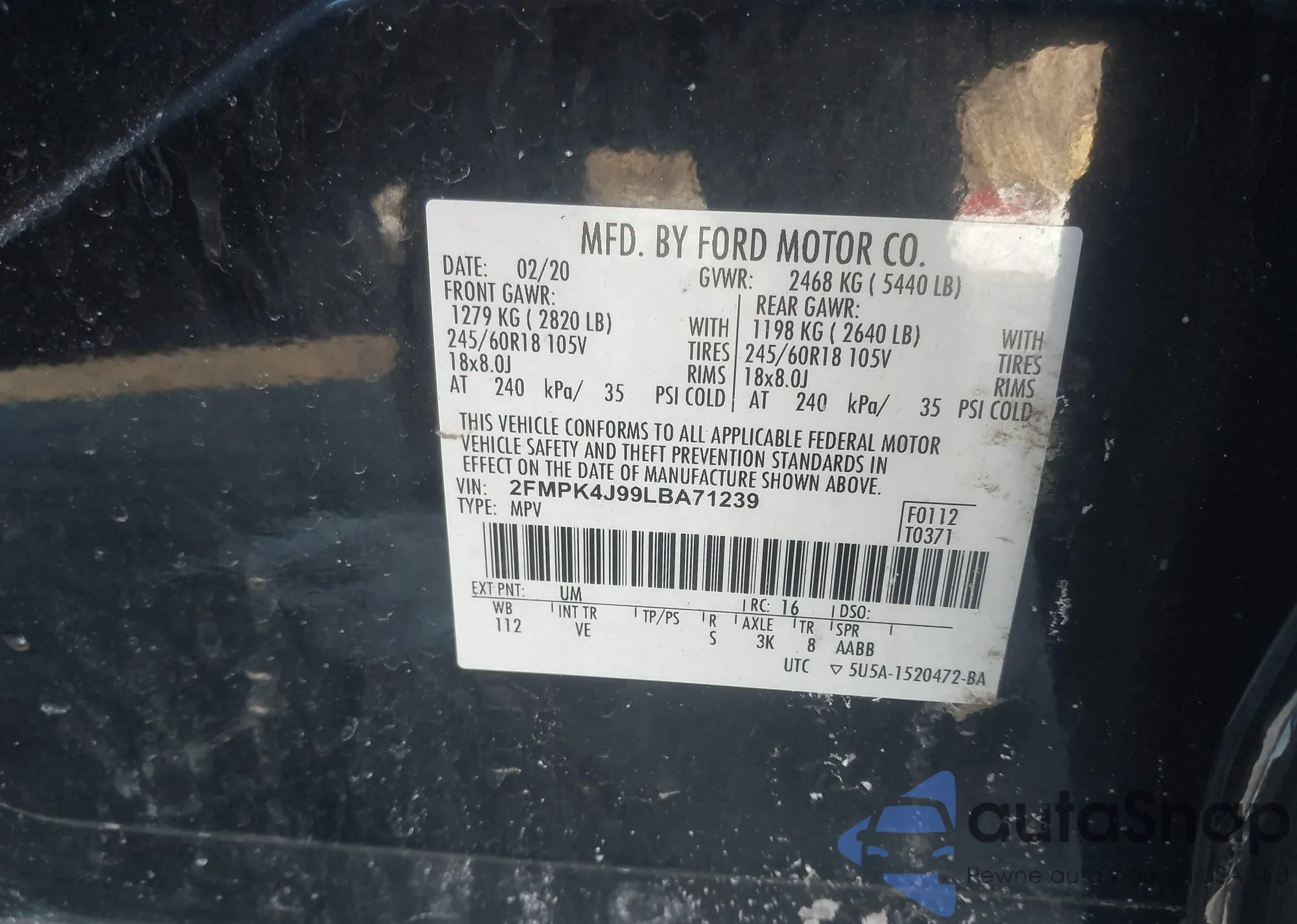 LOT: 76172625 VIN: 2FMPK4AP5LBA20030
