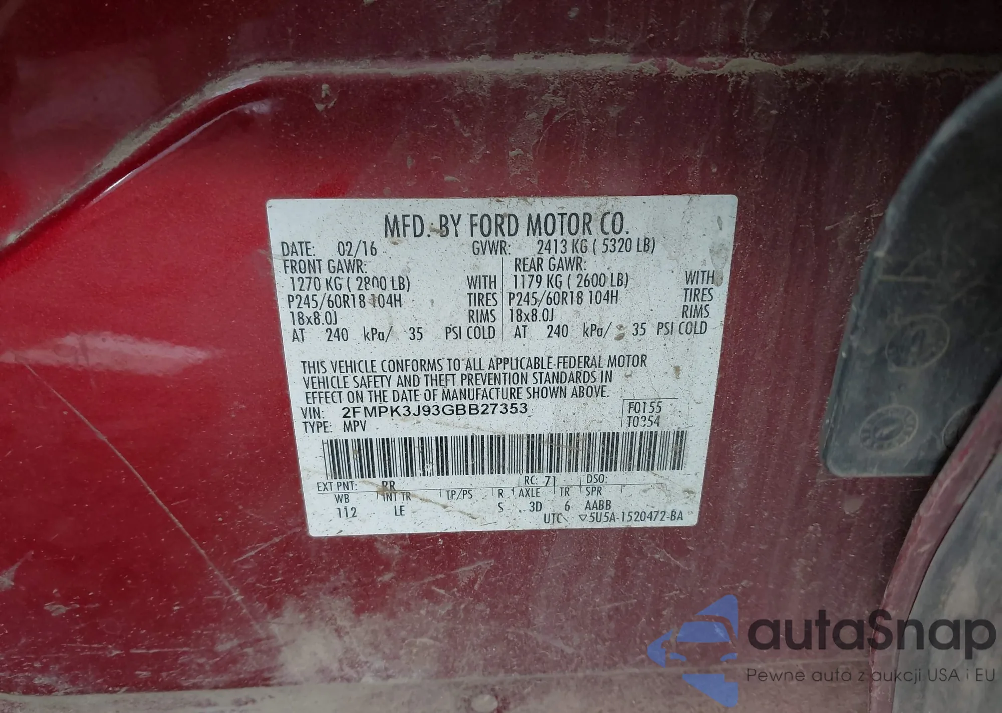 LOT: 43700520 VIN: 2FMPK3J93GBB27353
