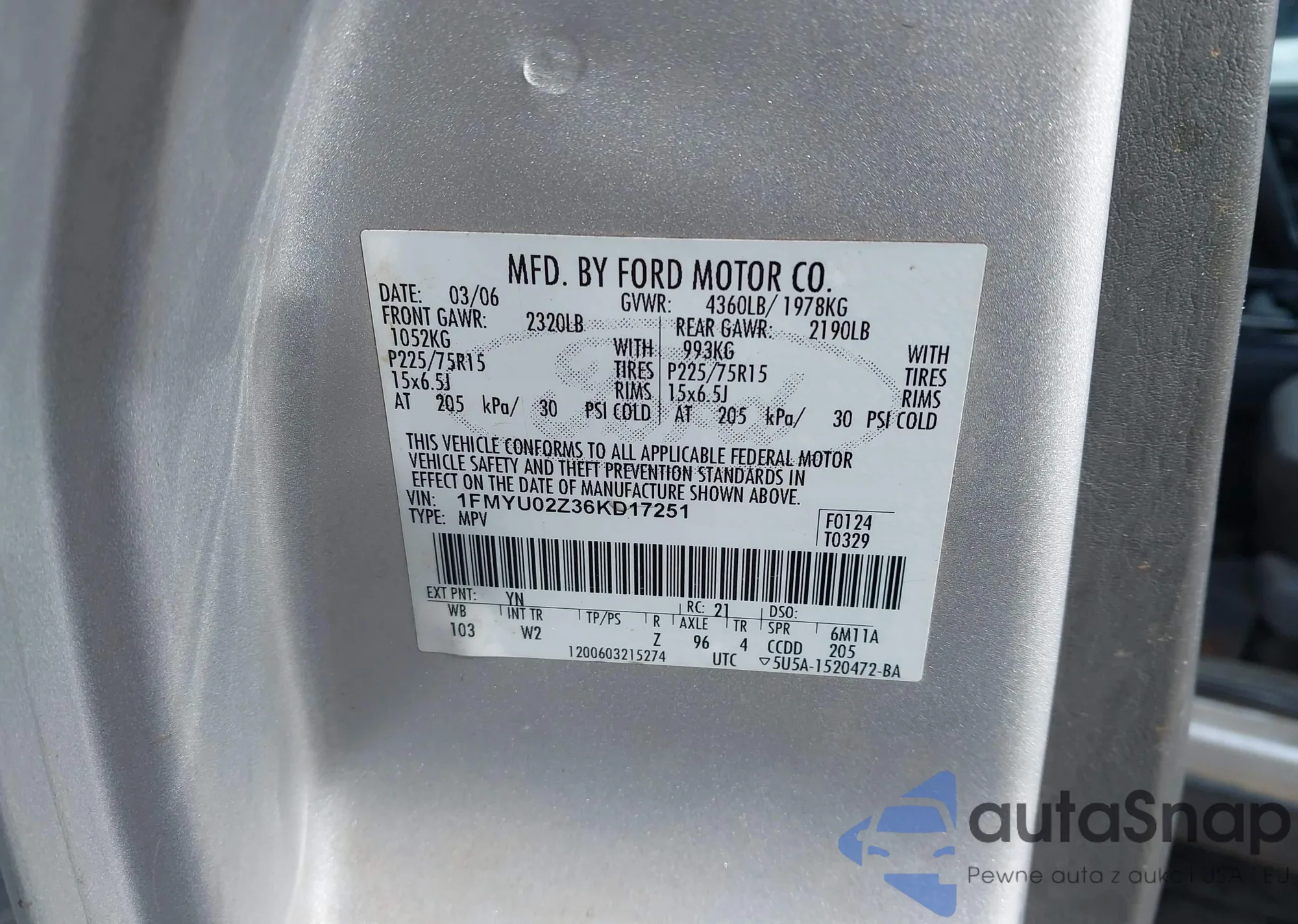 LOT: 44031306 VIN: 1FMYU03156KA03819