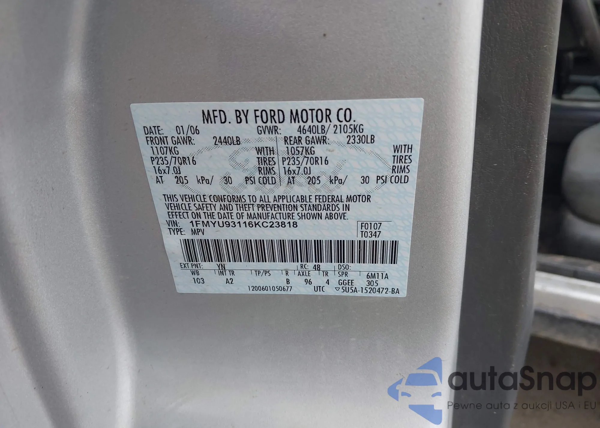 LOT: 44055839 VIN: 1FMYU93116KC23818